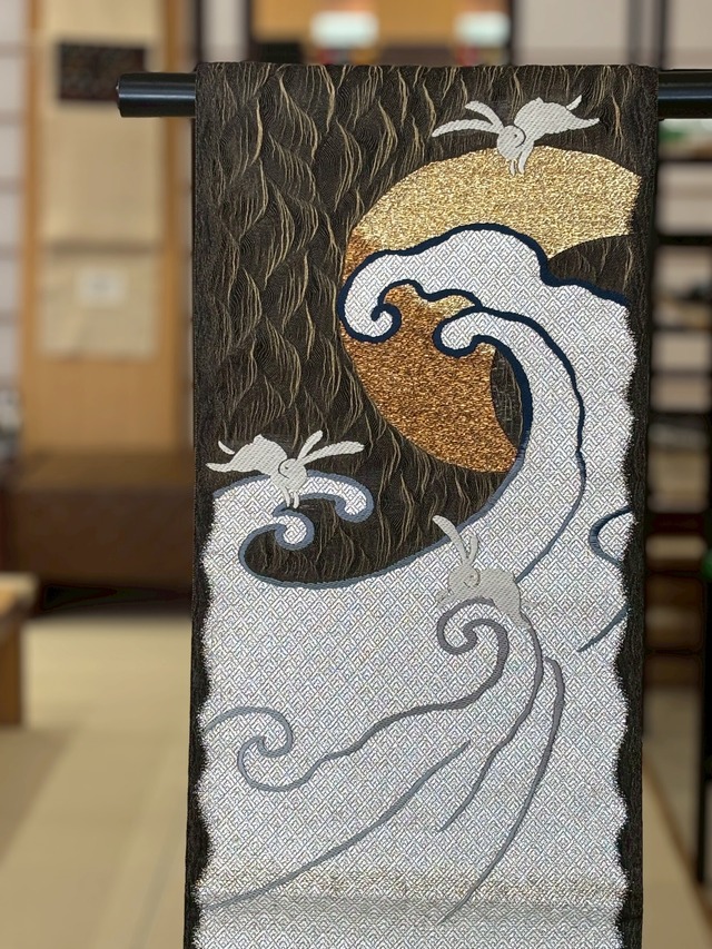 【商品説明】 西陣袋帯「波兎に三日月」 月夜に照らせれた夜の水面をよろけのある鈍い金糸で表しています。そこに大胆な波飛沫(なみしぶき)に、灯をともすような輝きのある三日月。元気に飛び跳ねる兎を後押ししているようですね。金銀糸で描かれた月や波の面となる白場の織部分も特徴あるアクセントです。 ※早速お問い合わせありがとうございます。 こちらの帯、西陣シールがすでになく、機屋さんが実は分かりませんm(__)m コーディネートで合わせている小紋は、浜縮緬地小紋「花むすび格子」でございます。 ひかえめな花むすびの可愛らしさと、くすみある色味が帯の引き立て役にもなってくれる優秀な小紋です! 【お仕立てについて】 詳しくは下記をご覧ください。 https://sugioshop2.base.ec/p/00009 【素材】 絹100%(金銀糸を除く) 【御仕立上がり寸法】 長さ 一丈一尺六寸程 巾 八寸二分 【ご着用の季節】 10月、11月の秋の季節 文化的なお出掛けに、飛躍のイメージから華やかなパーティーにもおすすめです。 ご覧になる画面によって、実際のお色味や、風合いに違いを感じる場合もございます。 お手元確認https://sugioshop2.base.ec/p/00010 や、ご来店で気になるお品を実際に見てみる事もおすすめしておりますので、ご希望の場合は、決済に進まずに、まずは、ぜひ店舗にご連絡をお待ちいたしております。 また、気になるお品の別カットのお写真や、お持ちのお着物、帯とのコーディネート、寸法などにつきましても、お気軽にお問い合わせをくださいませ。 お電話 0166-26-2575 メール [email protected] 公式ライン https://lin.ee/bDJqDx