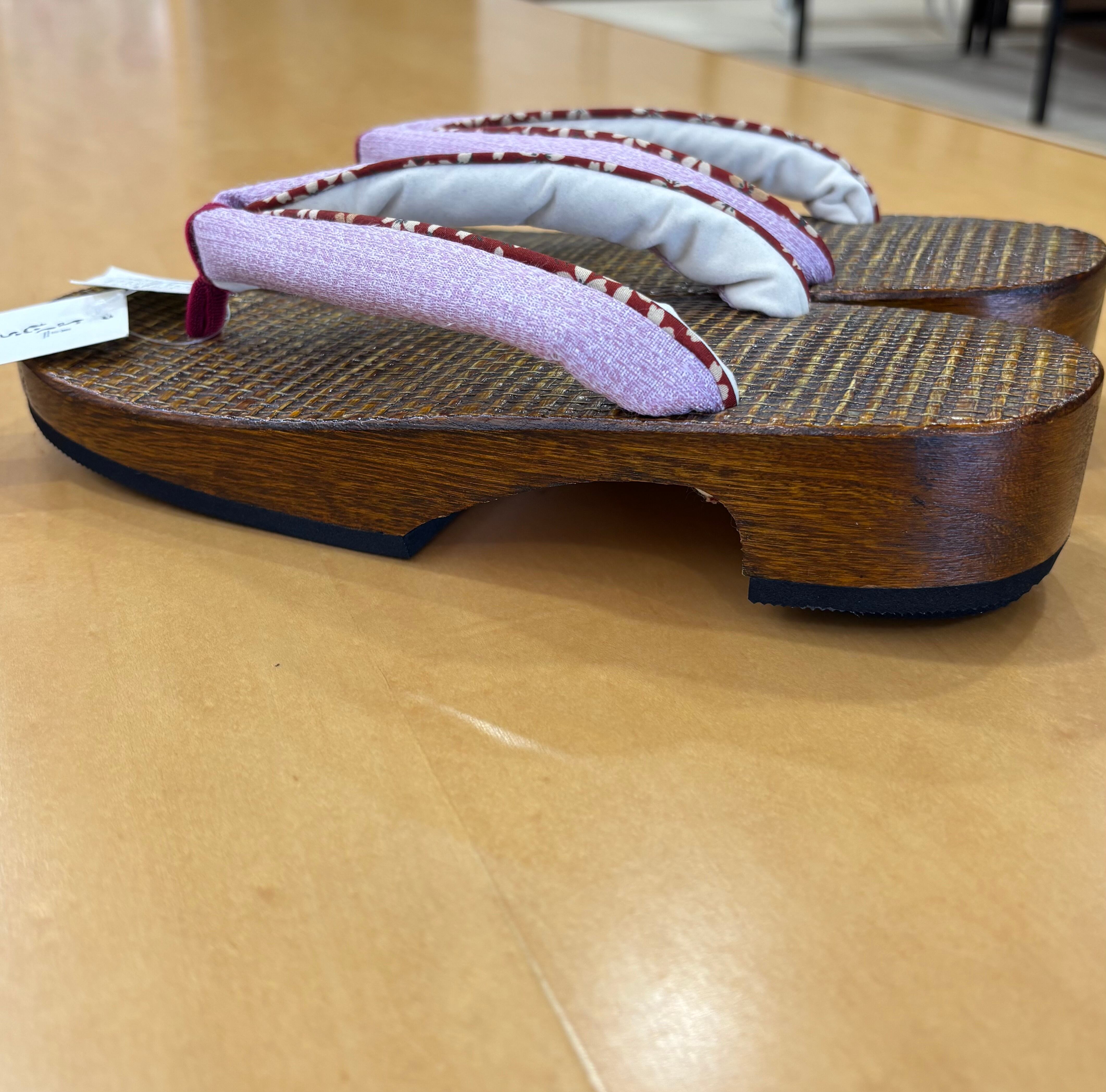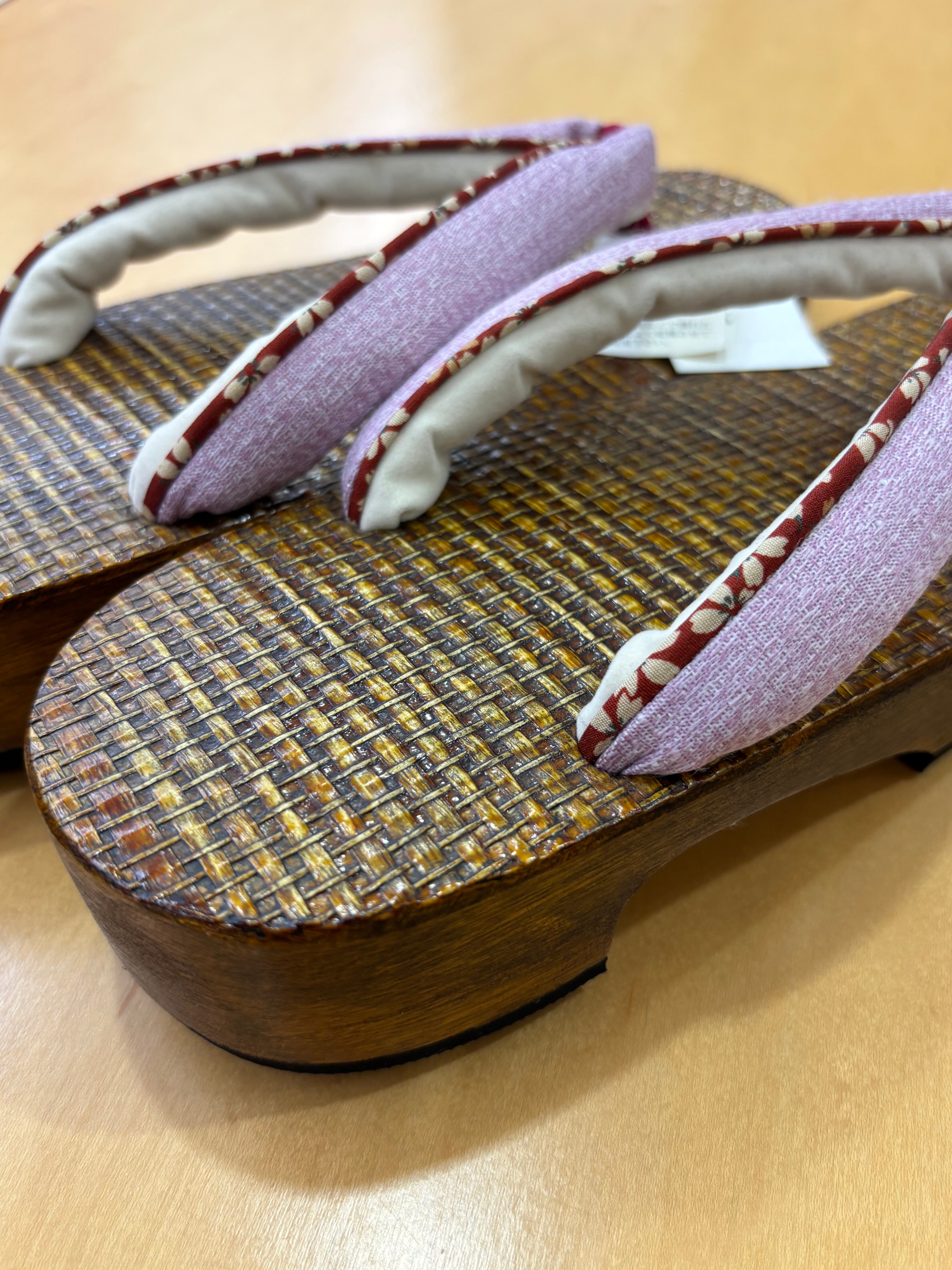 桐下駄 「濃いめの木の色に、パープルの花緒、赤のつぼ」