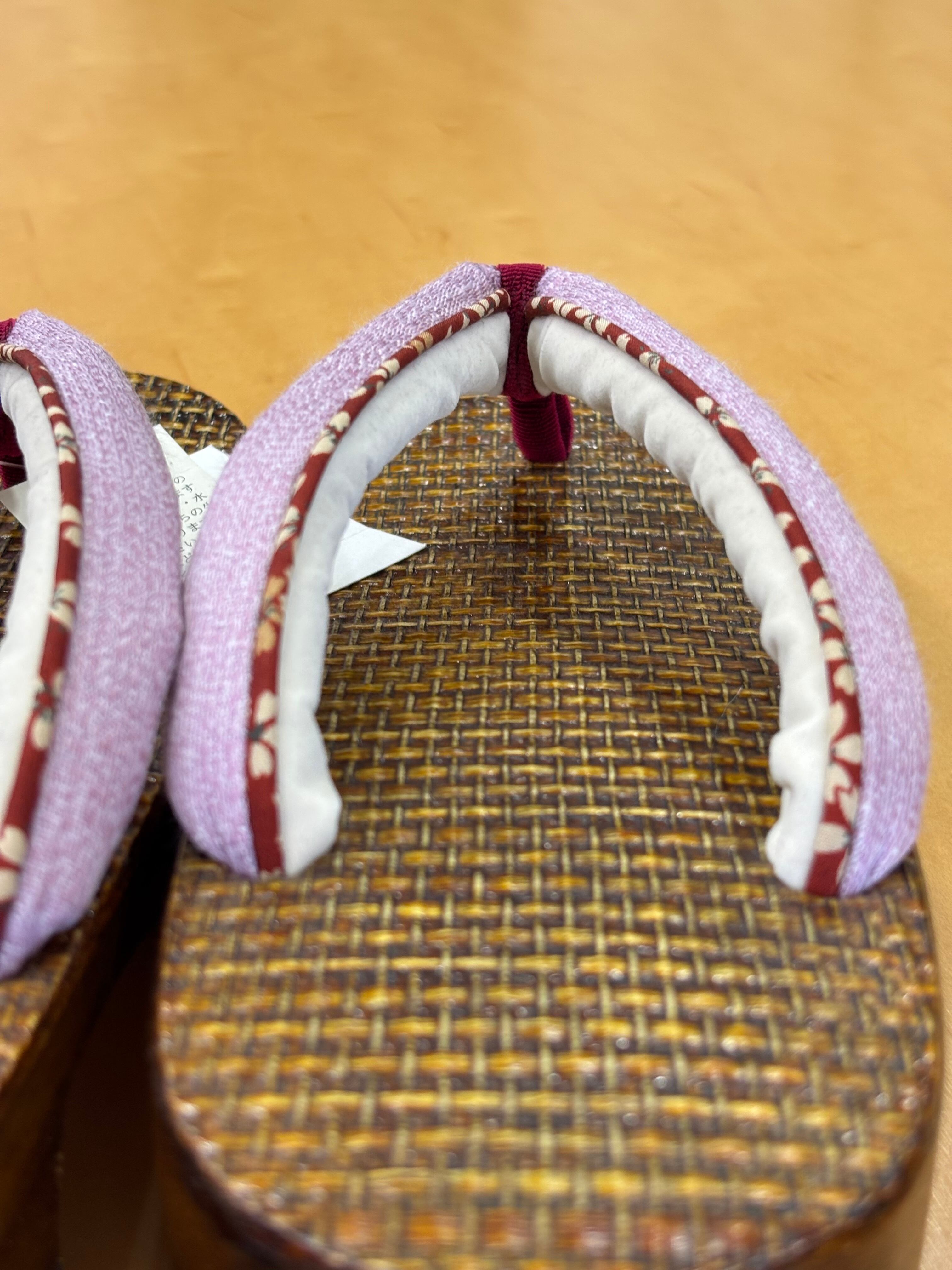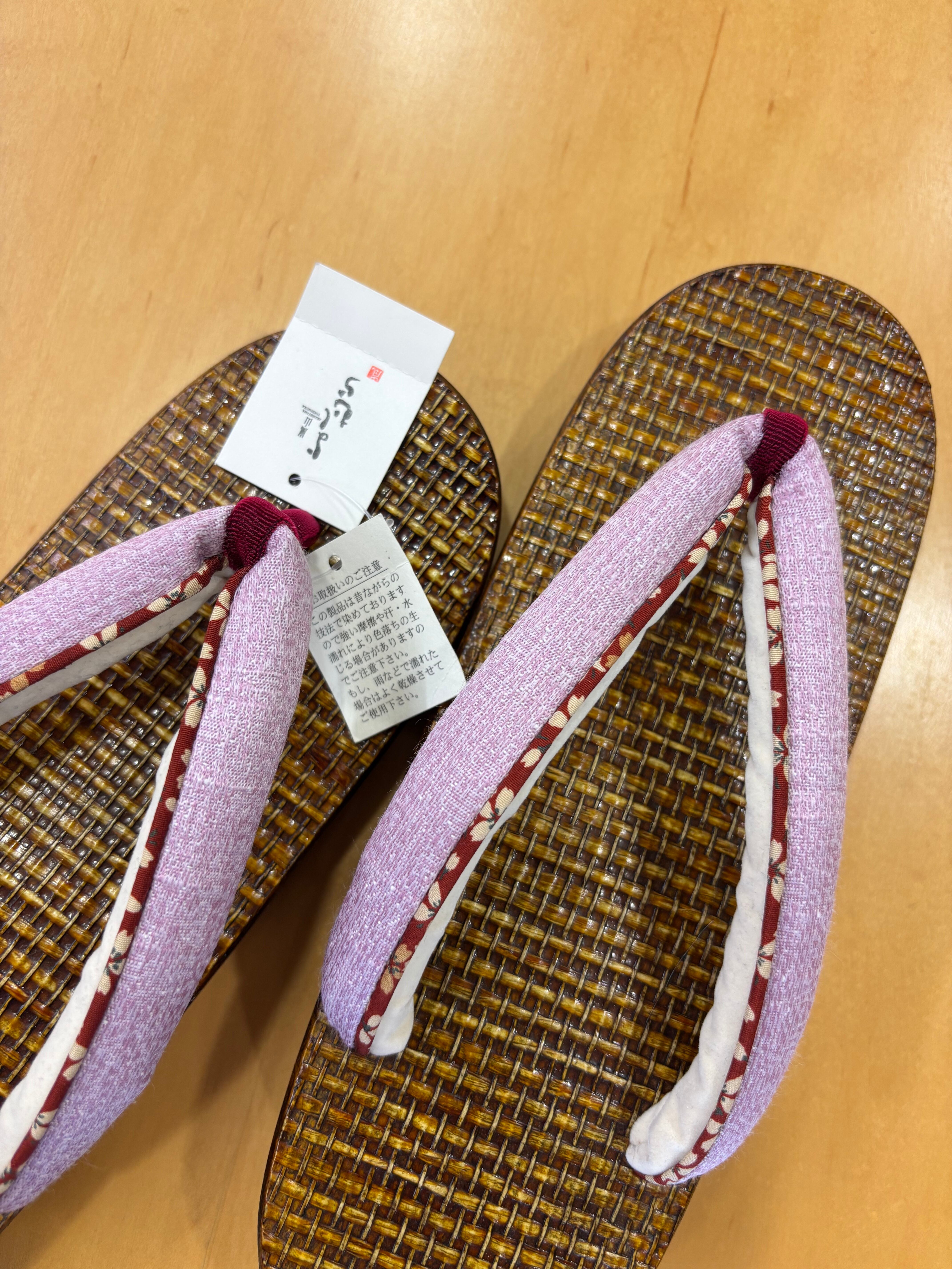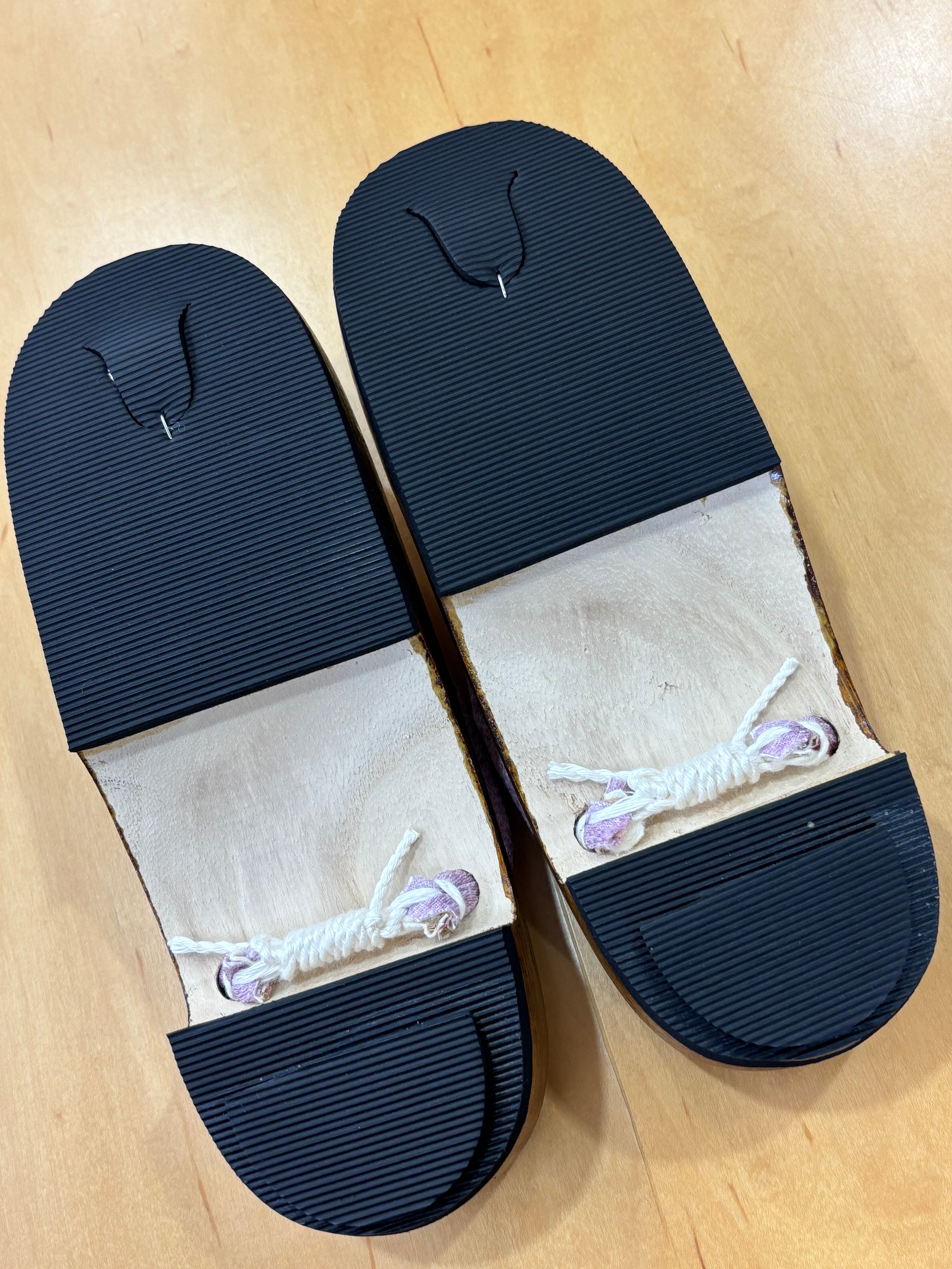 一番大切な足裏につく台は和紙でコーティングされた桐台。お草履とちがって、歩くと下駄のかかとが地面に付く音がおだやかな風情があってとてもいい感じです。素足で履いても、お着物にあわせるときは足袋付きでもOK。ジーンズでのお出掛けに素足も素敵ですよ(^^)/