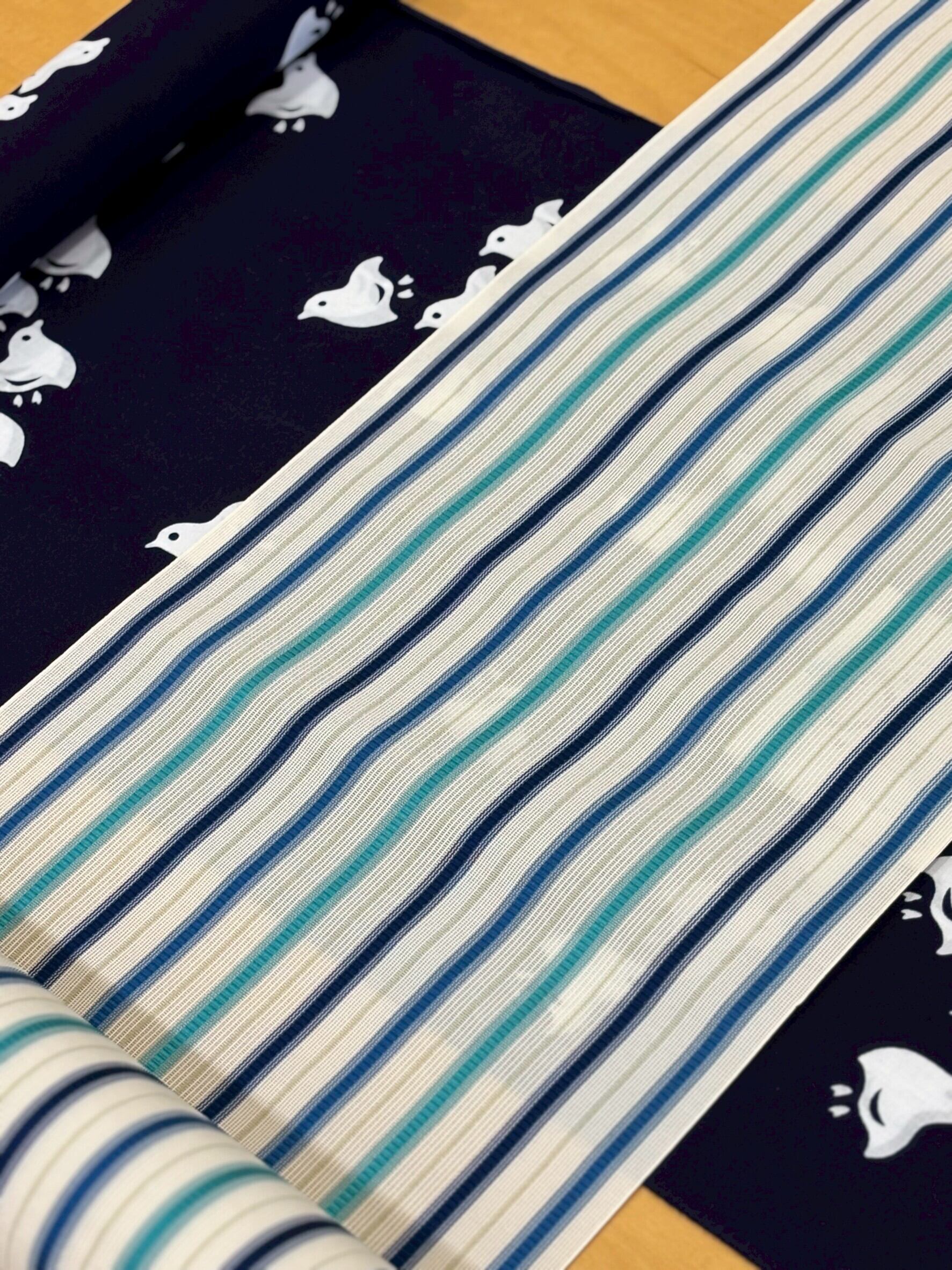 夏を代表する色「青、ブルー、グリーン系」が着姿をキリっと引き締めてくれます。無地感の単衣・夏着物、同系色の装いにアクセントとして選んでみてください(^^)/カジュアル路線にも、もちろんOKですが、和稽古事にも実はとっても重宝する献上帯。単衣や薄物の色無地一つ紋や、小紋にも活躍します。