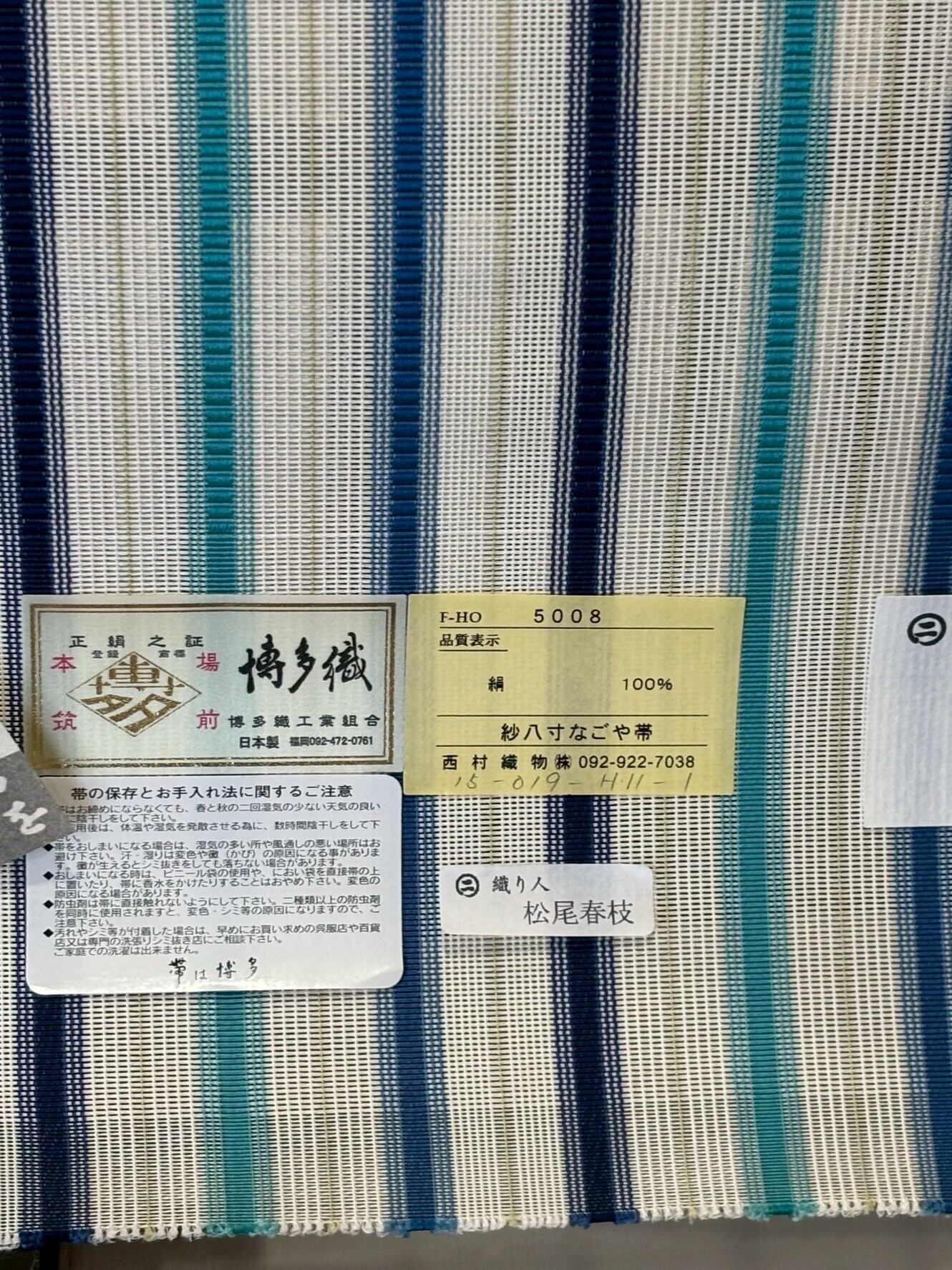 紗献上八寸名古屋帯「青、グリーン系の縦縞」