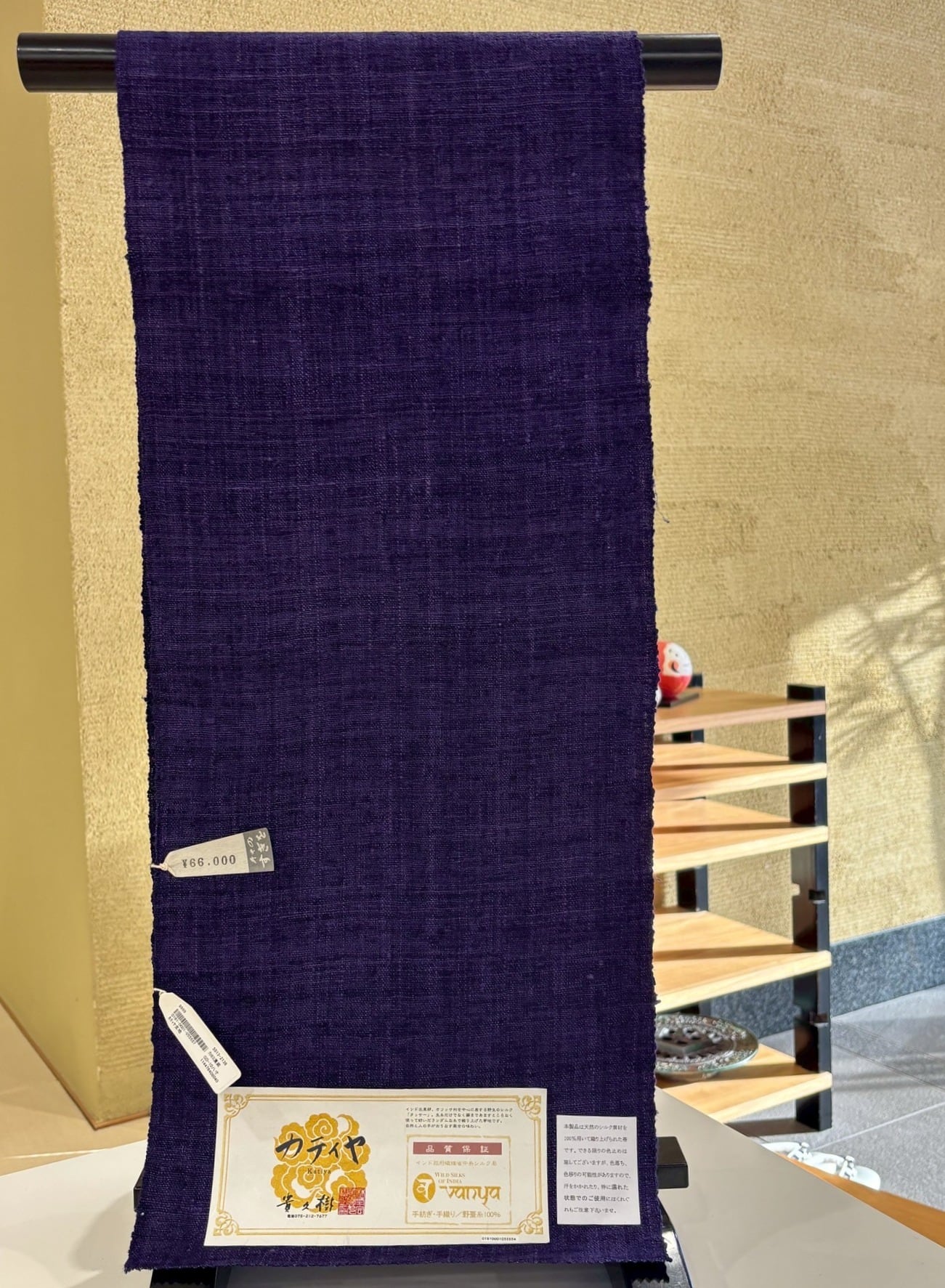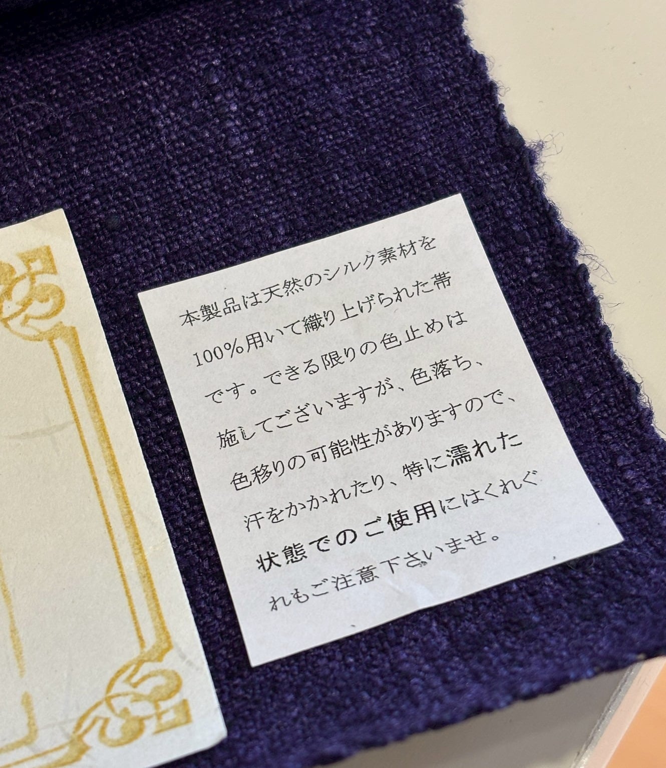 misako自身は15年ほど前に初めてカティヤをいただきました。その時のものはとても柔らかく生地の面もするするとした感触でしたが、今回はとても張りがあって締めるほどに馴染んでくる、という感覚です。本番のお出掛け前に、ぜひ2、3度じっくりと締めて慣らしていただければと思います!
