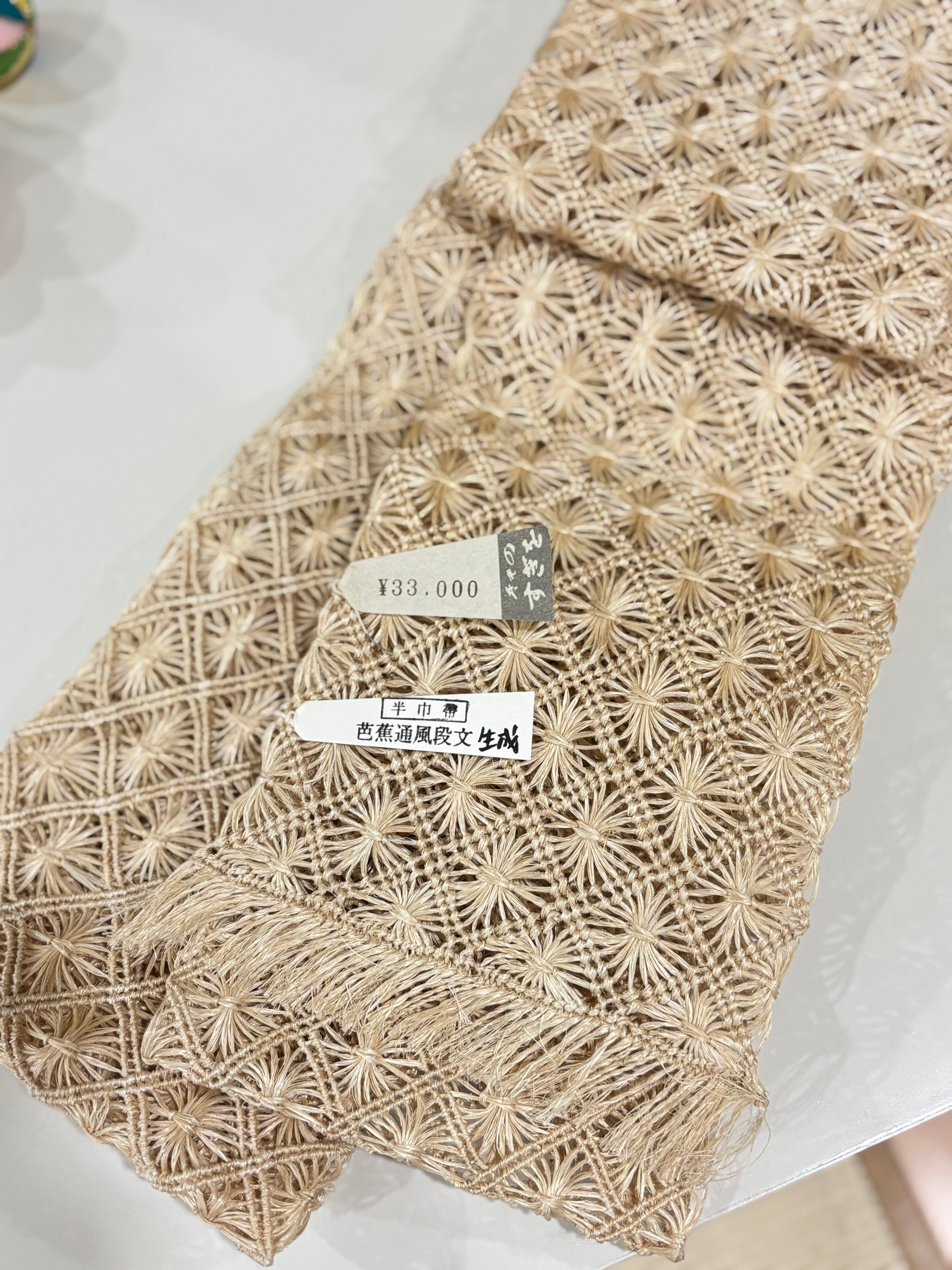 誉田屋源兵衛のお馴染みの糸芭蕉で織られた半巾帯でございます。袋状ではなく、単衣帯ですのでざっくりとした感触もそのままに、自然布の風情もそのままにお召しいただけると思います。