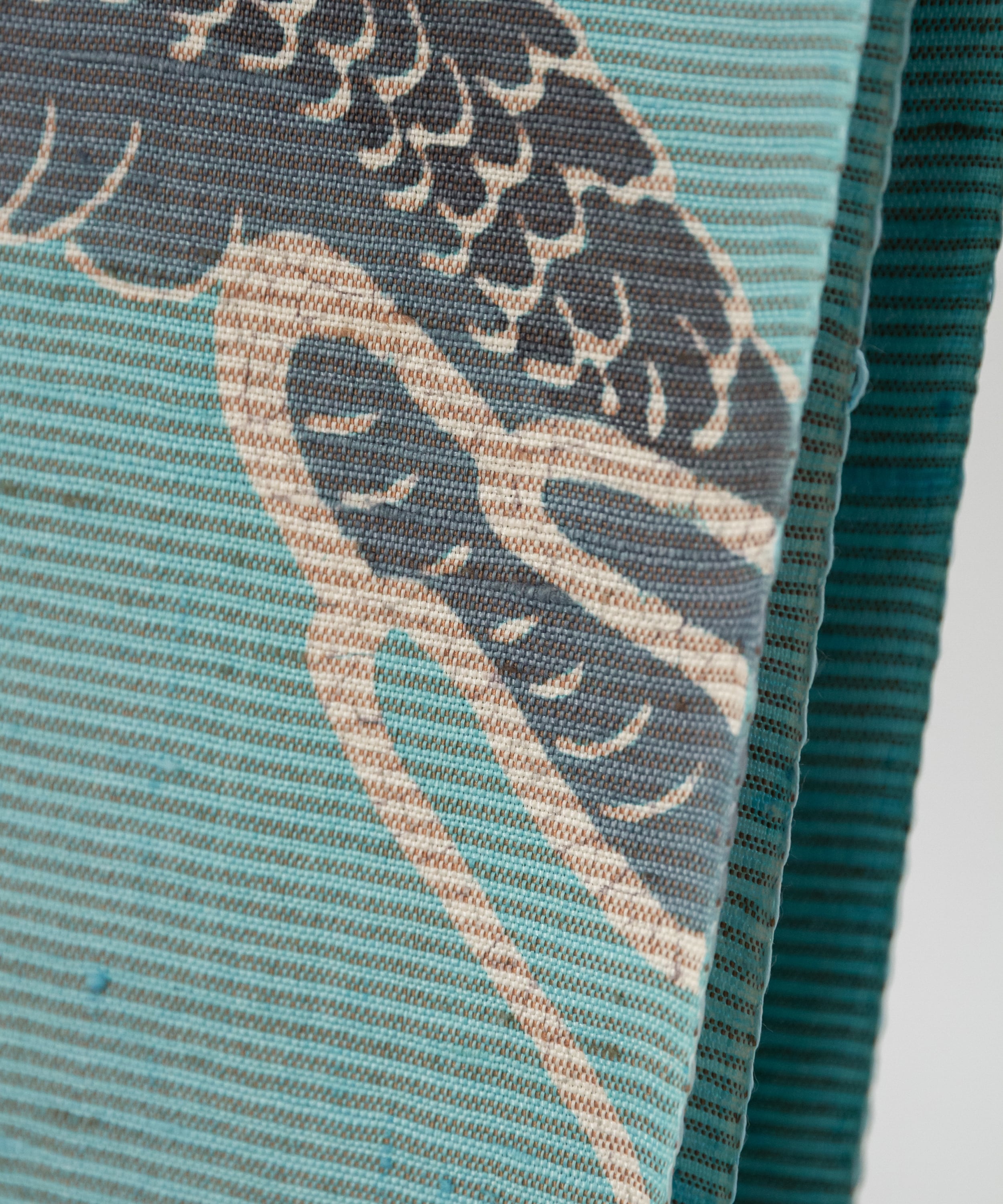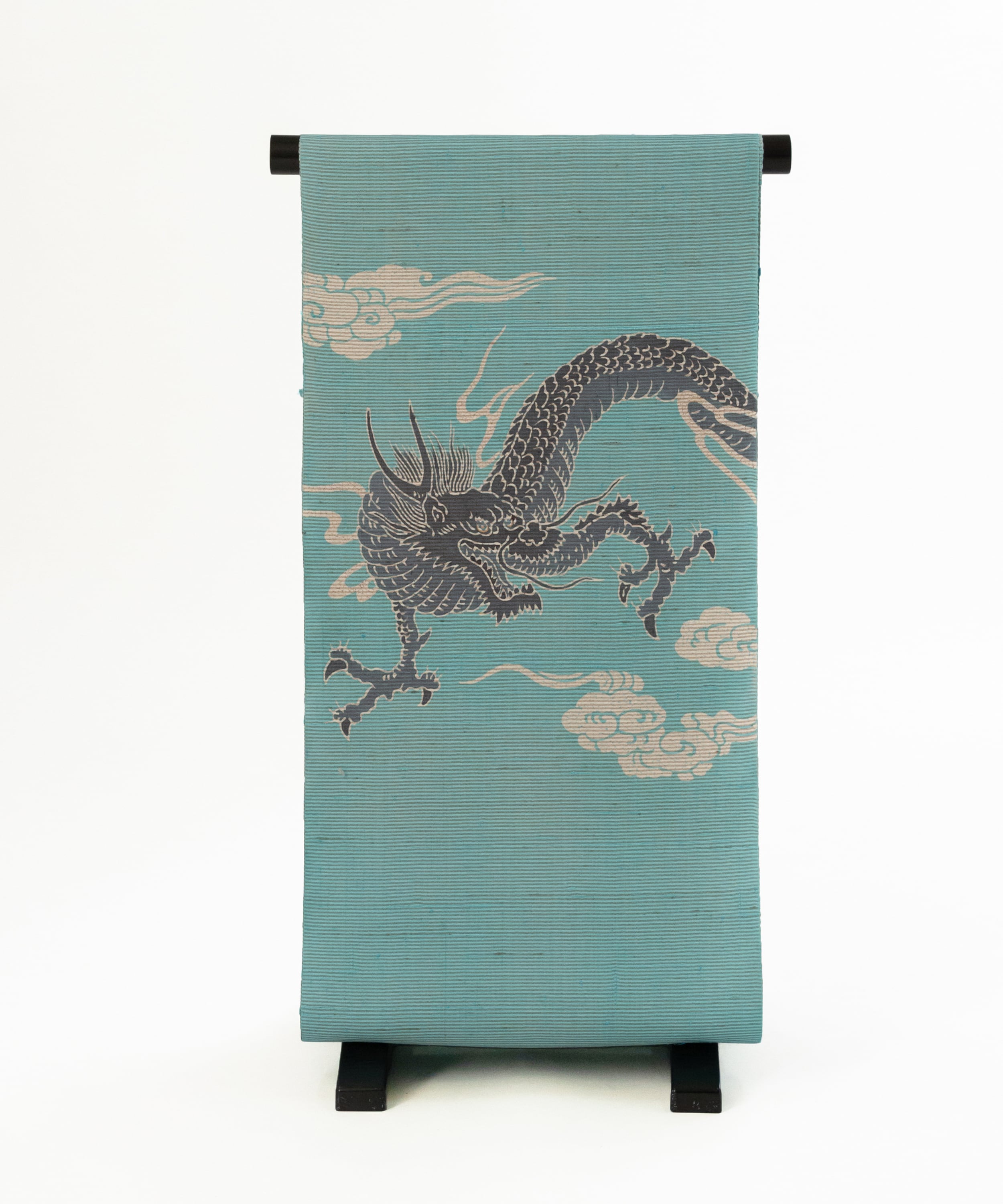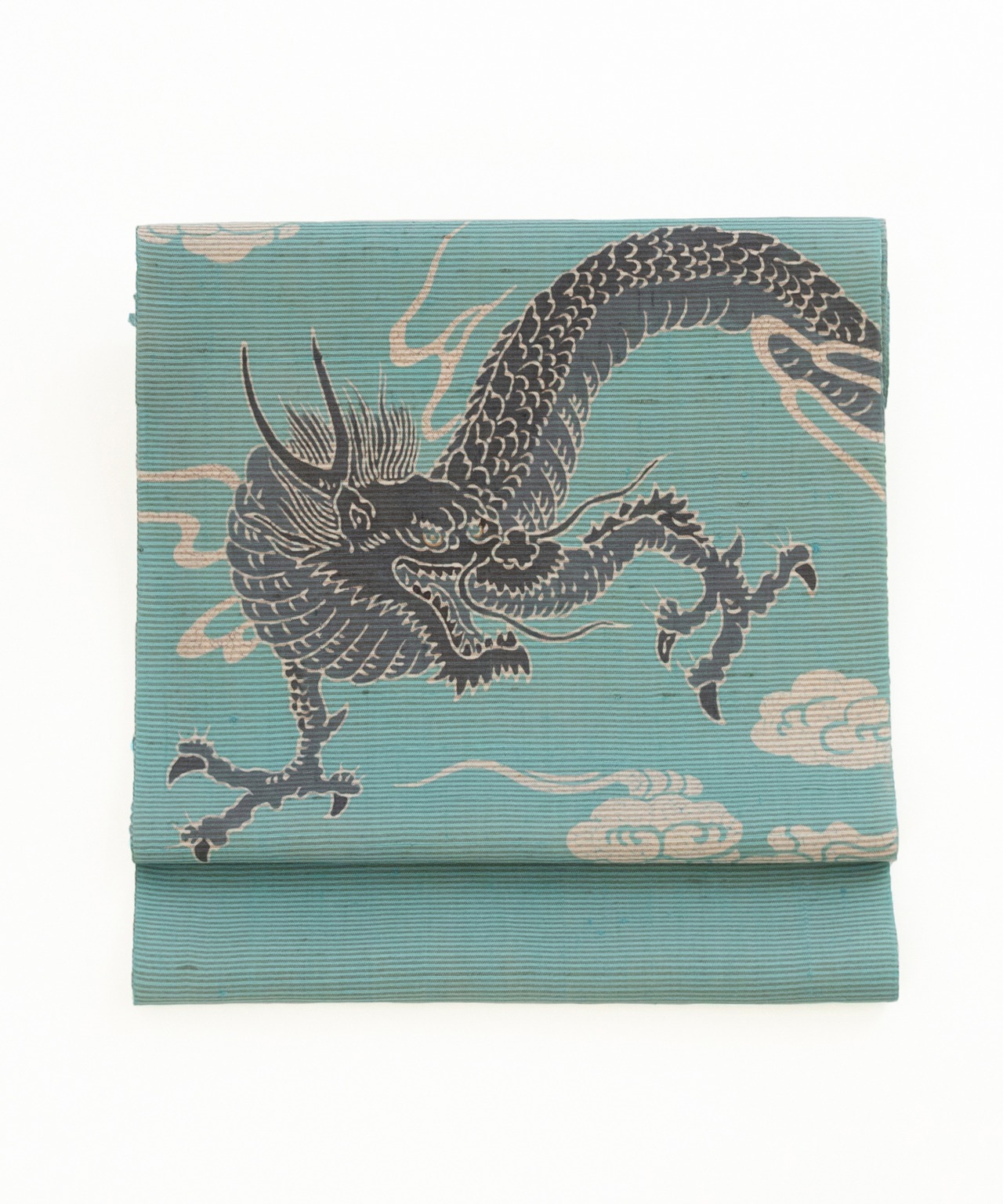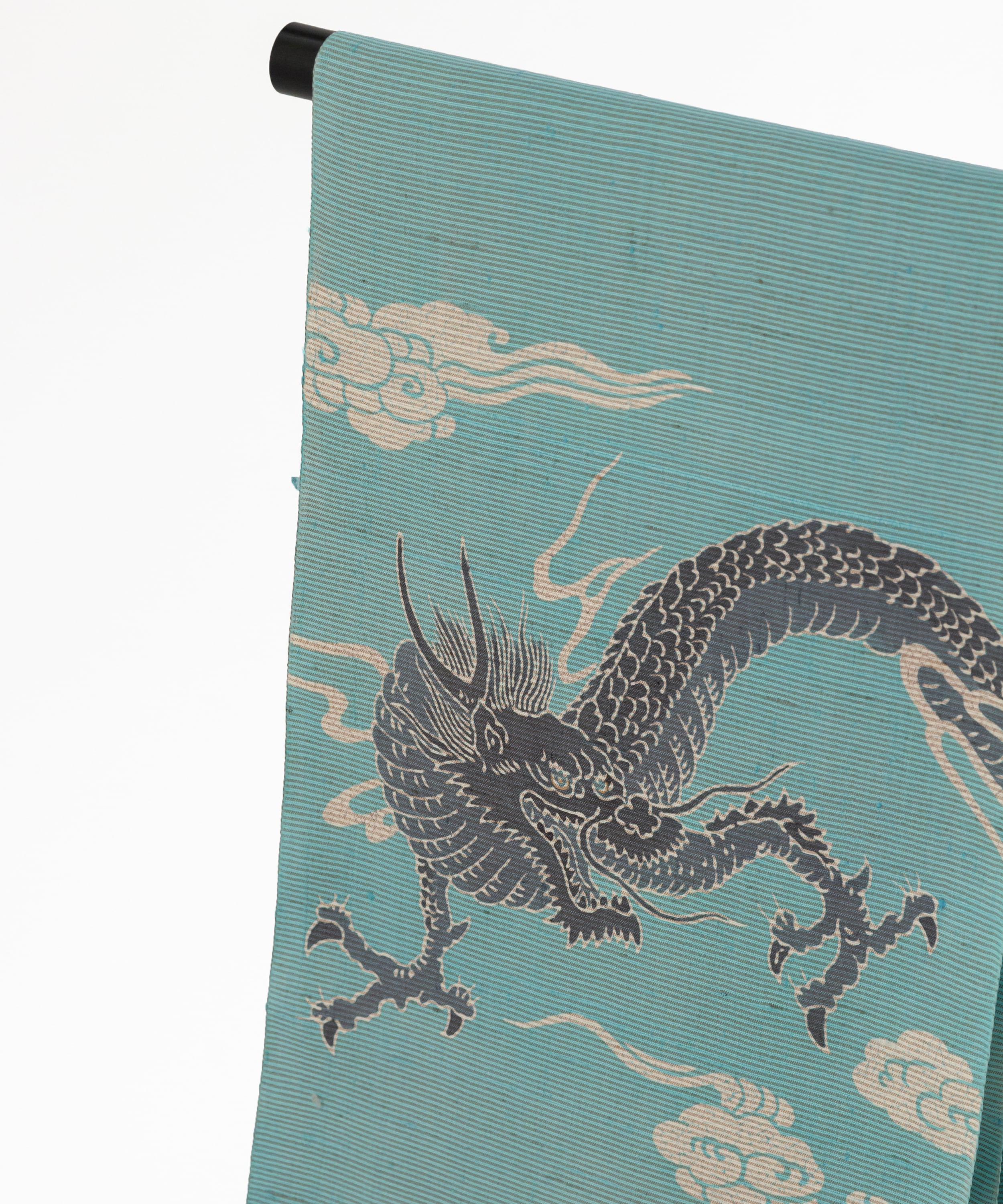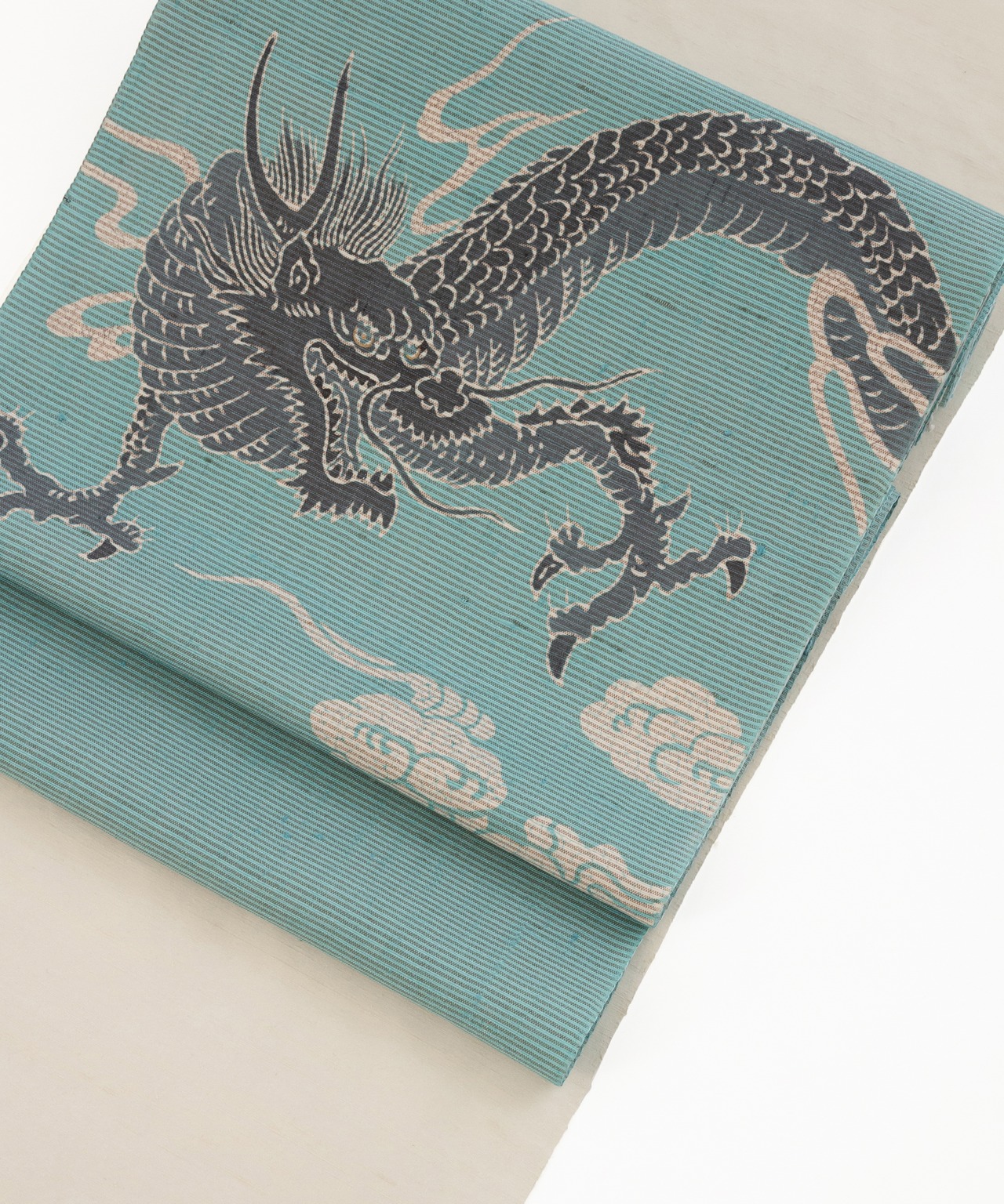 平面の生地の中から雲の間を力強く突き抜けてくるような「龍」の圧倒的な躍動感。それに対して柔らかなオフグレーや白、ソフトな水色の地と合わさって、モダンな静けさも感じます。