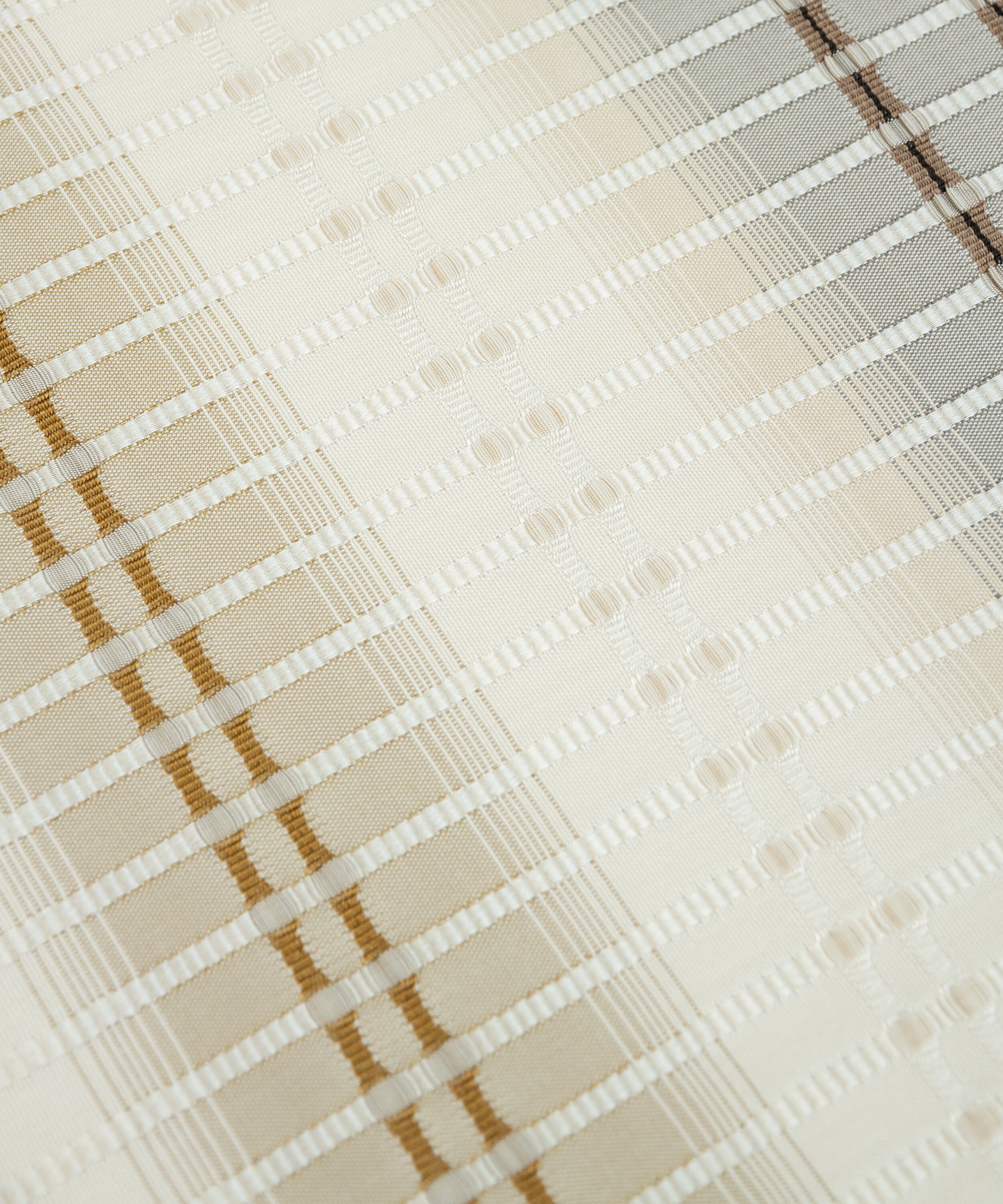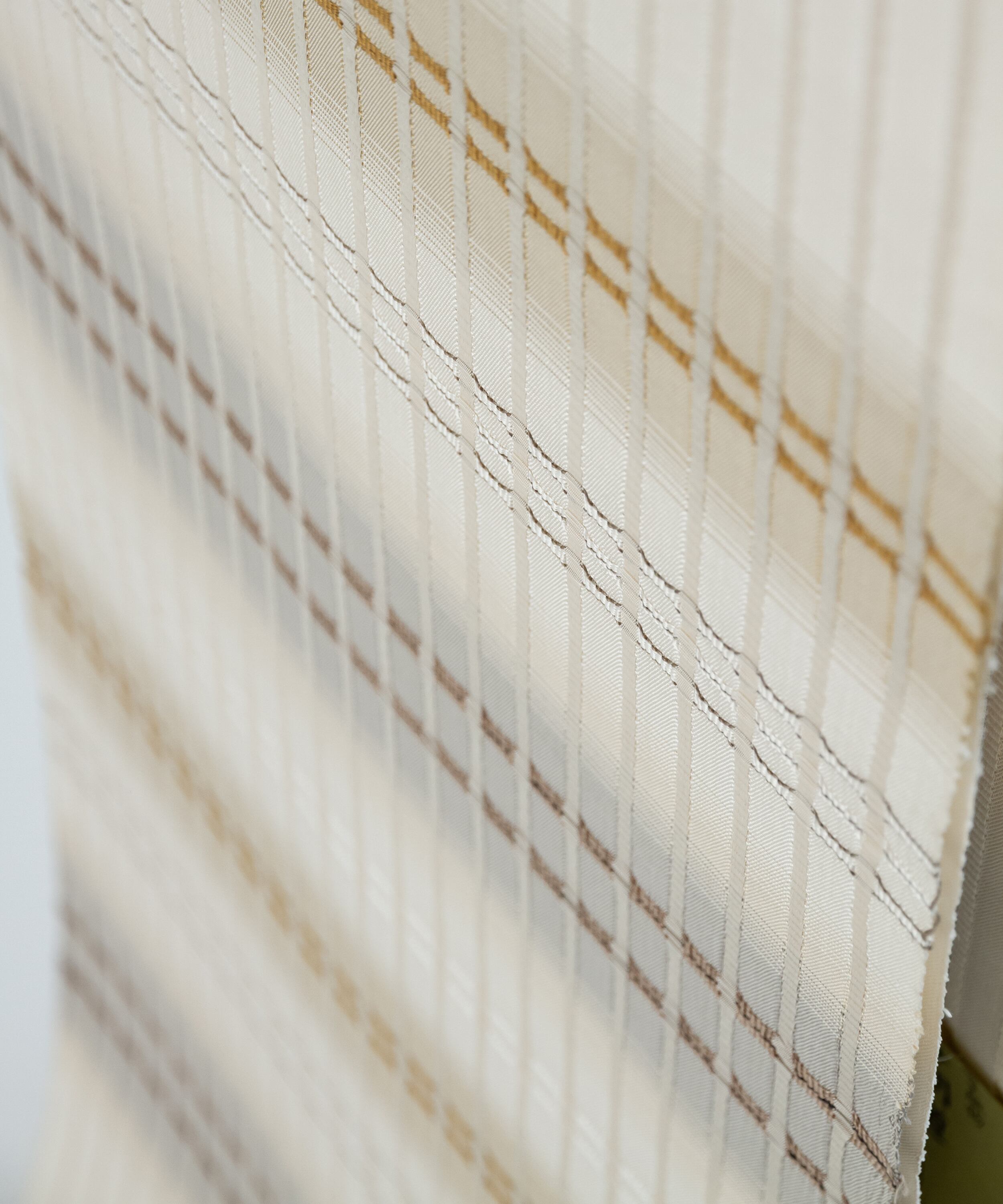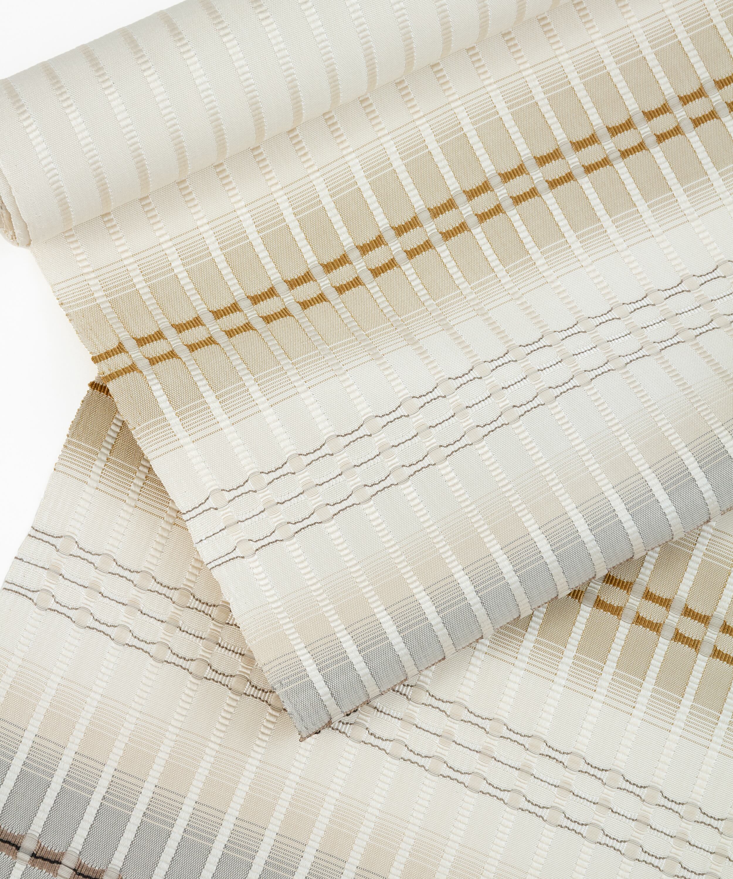 浮き織の技法を用いて縞や格子に表した草木染による吉野織りのやわらかな浮織の畝は、独特の存在感をもちます。