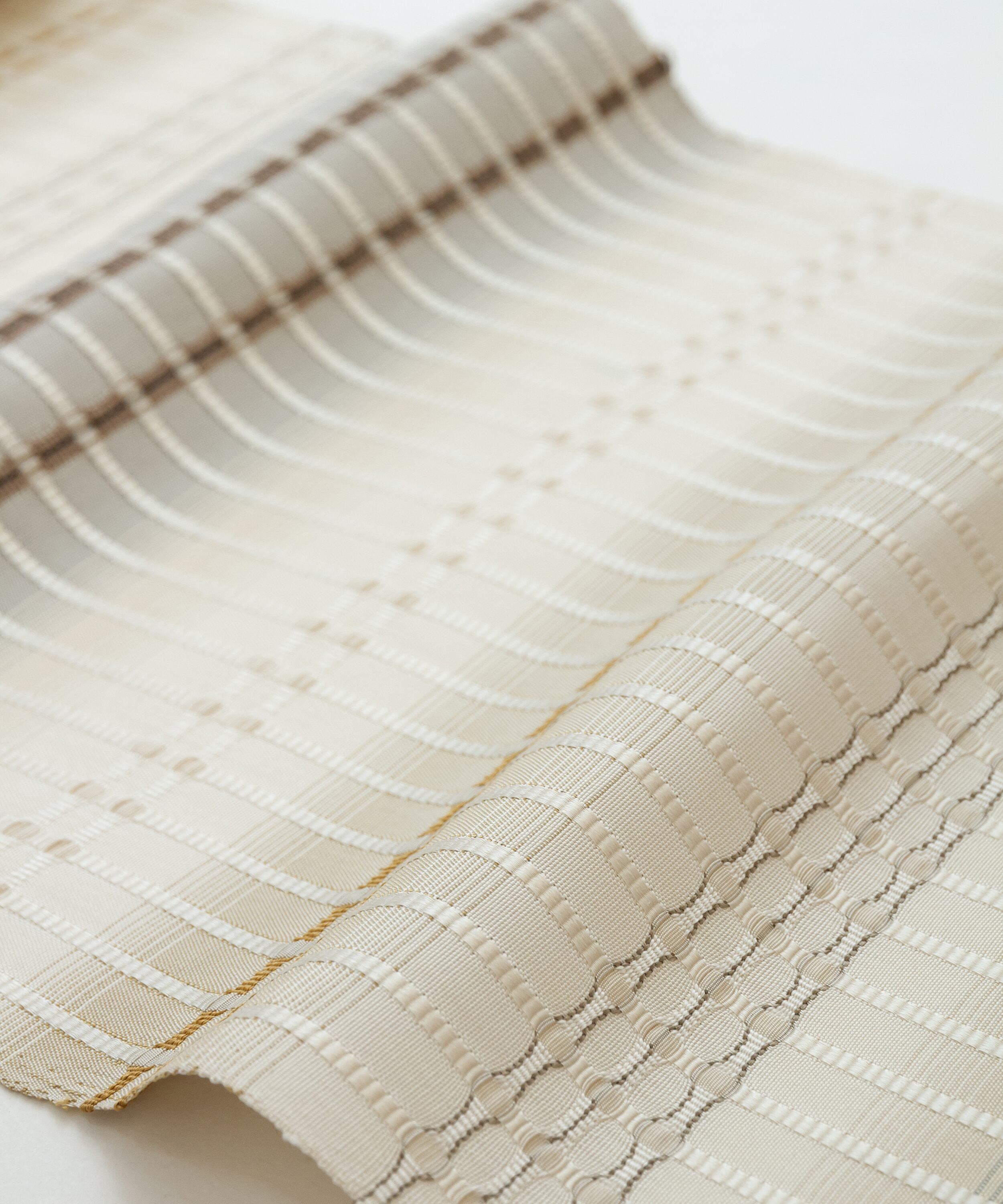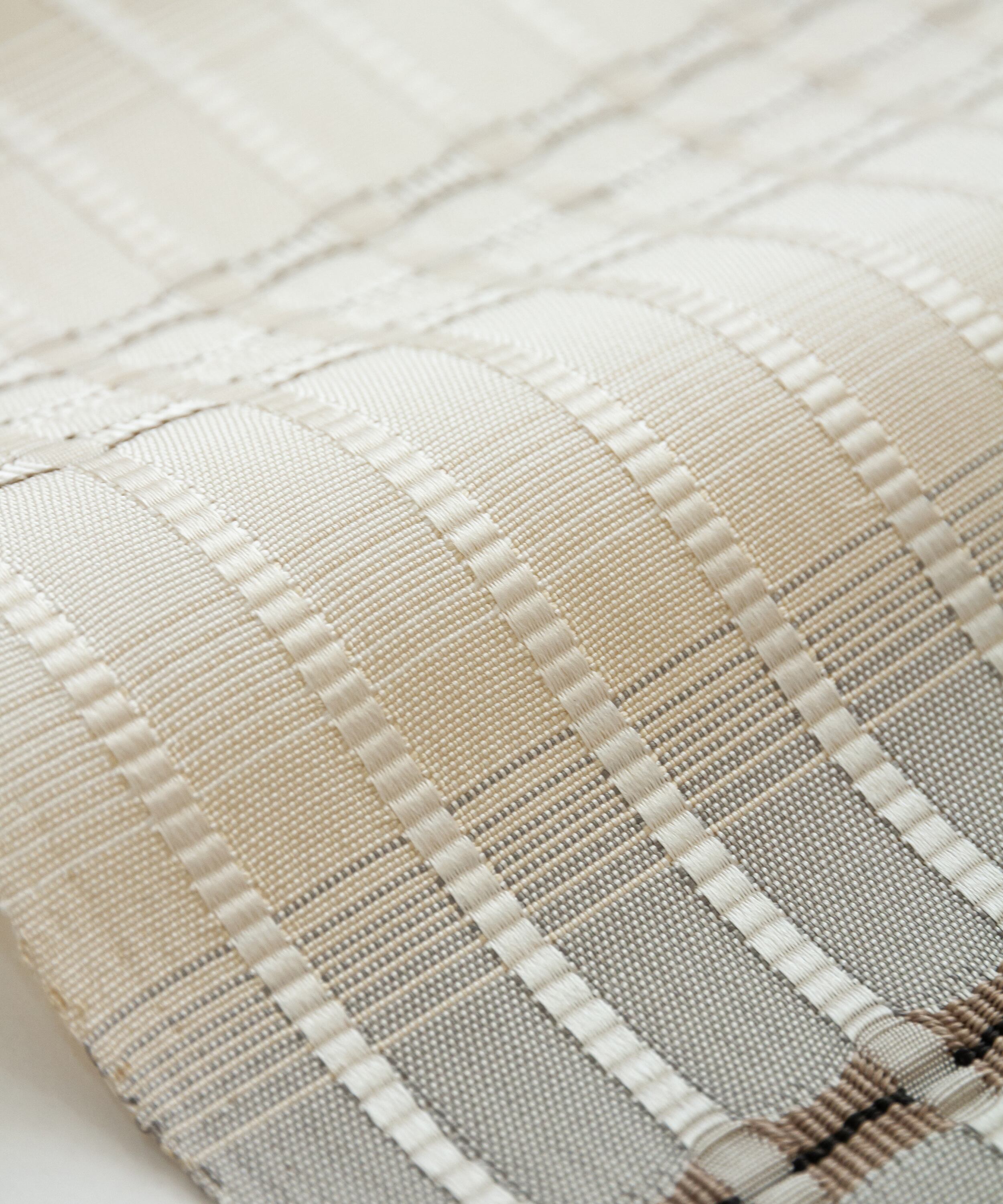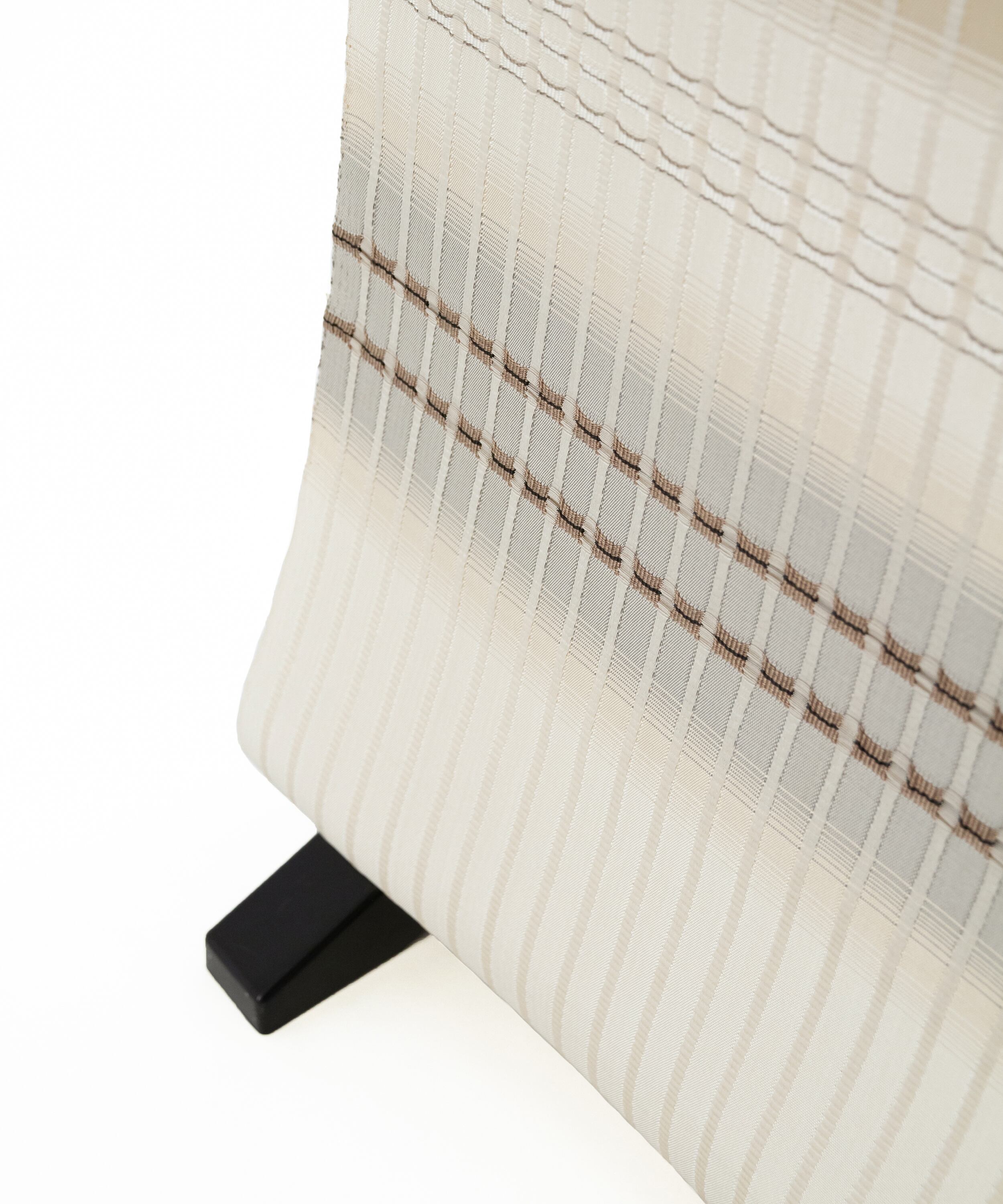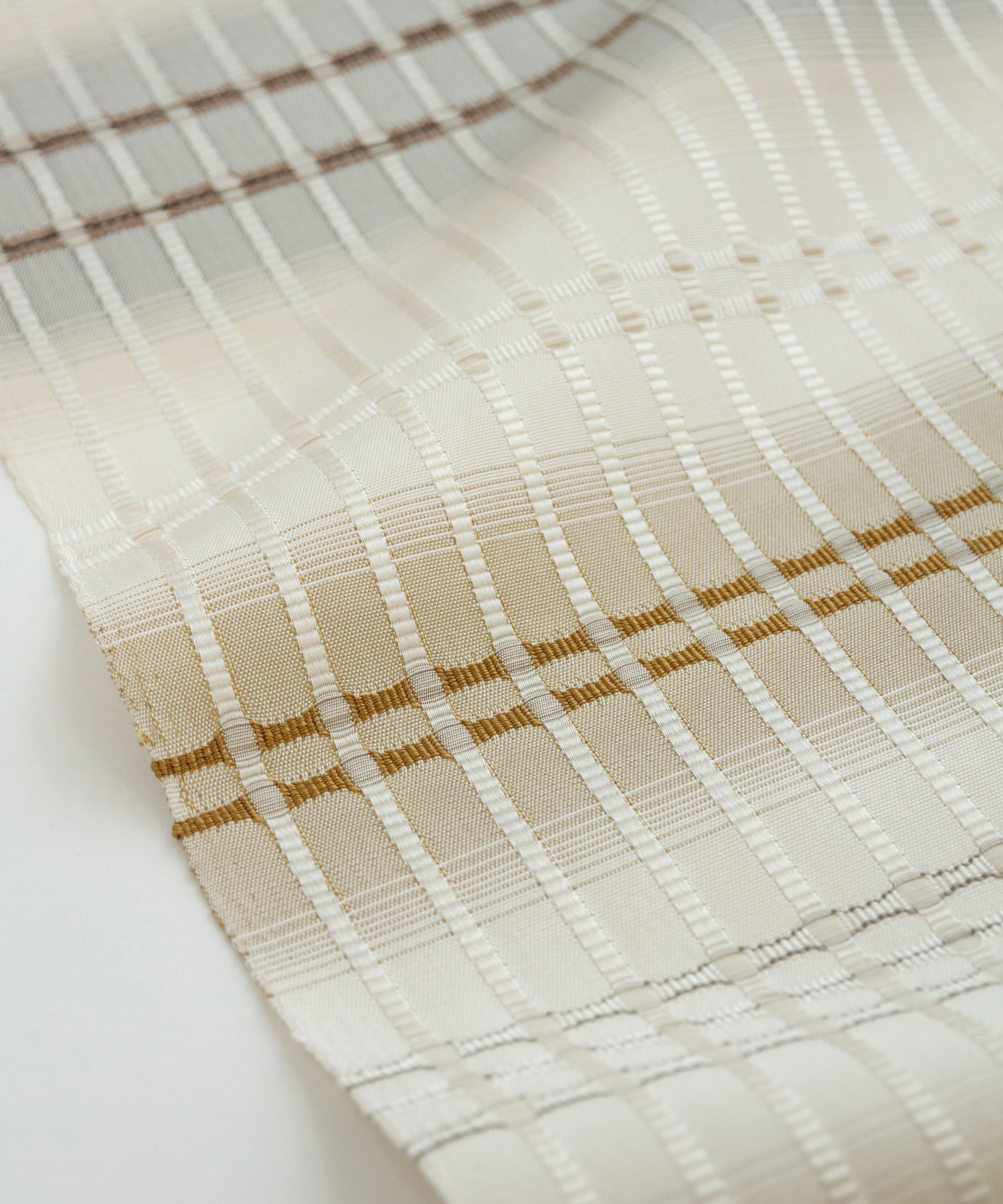 浮き織の技法を用いて縞や格子に表した草木染による吉野織りのやわらかな浮織の畝は、独特の存在感をもちます。