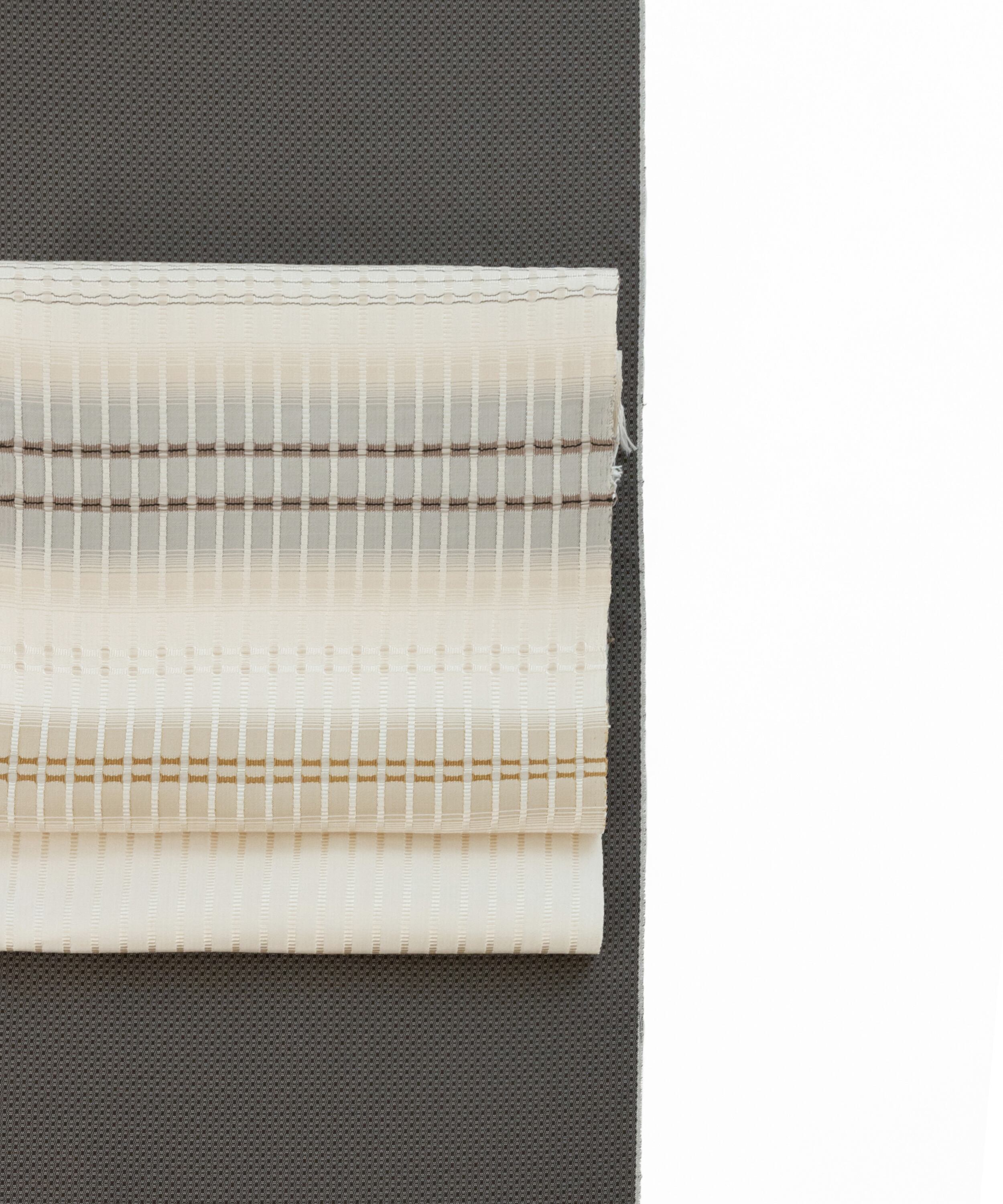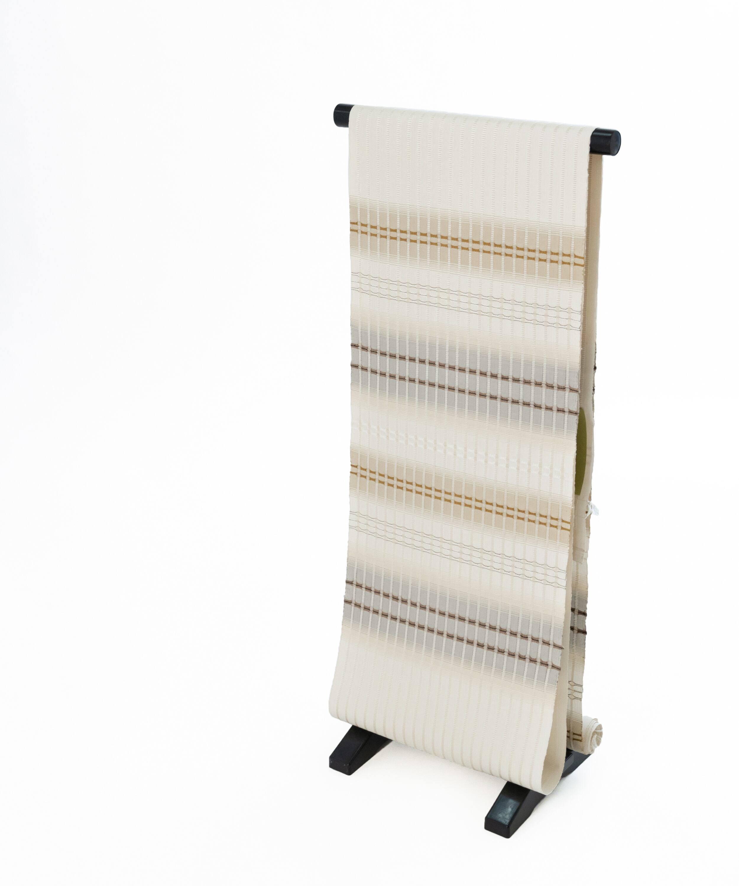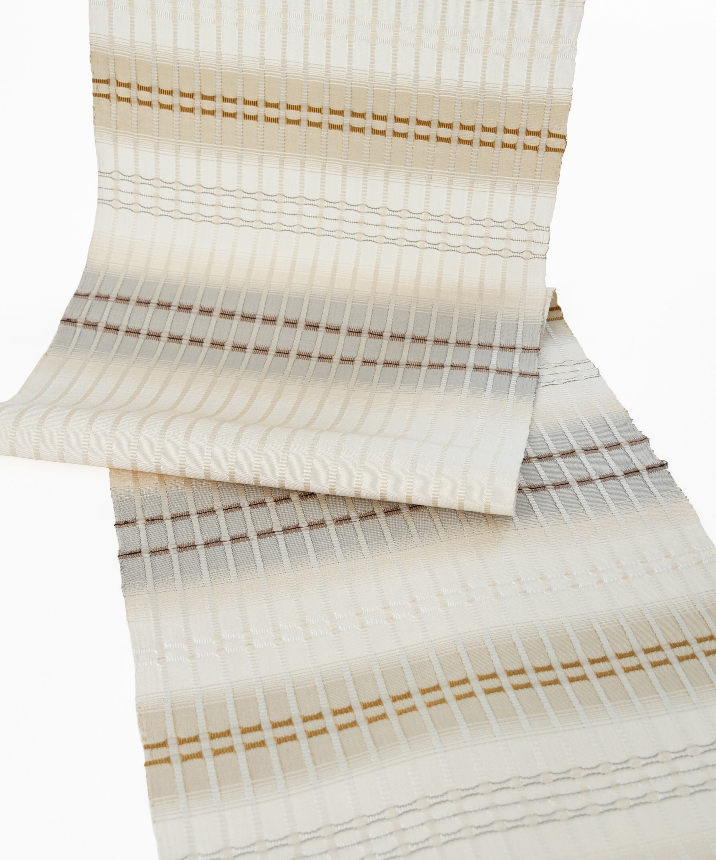 美しい光沢を放つ吉野織り、草木染めならではの透明感ある色彩が溶け合うような柔らかな色彩のグラデーション、艶やかな帯地。