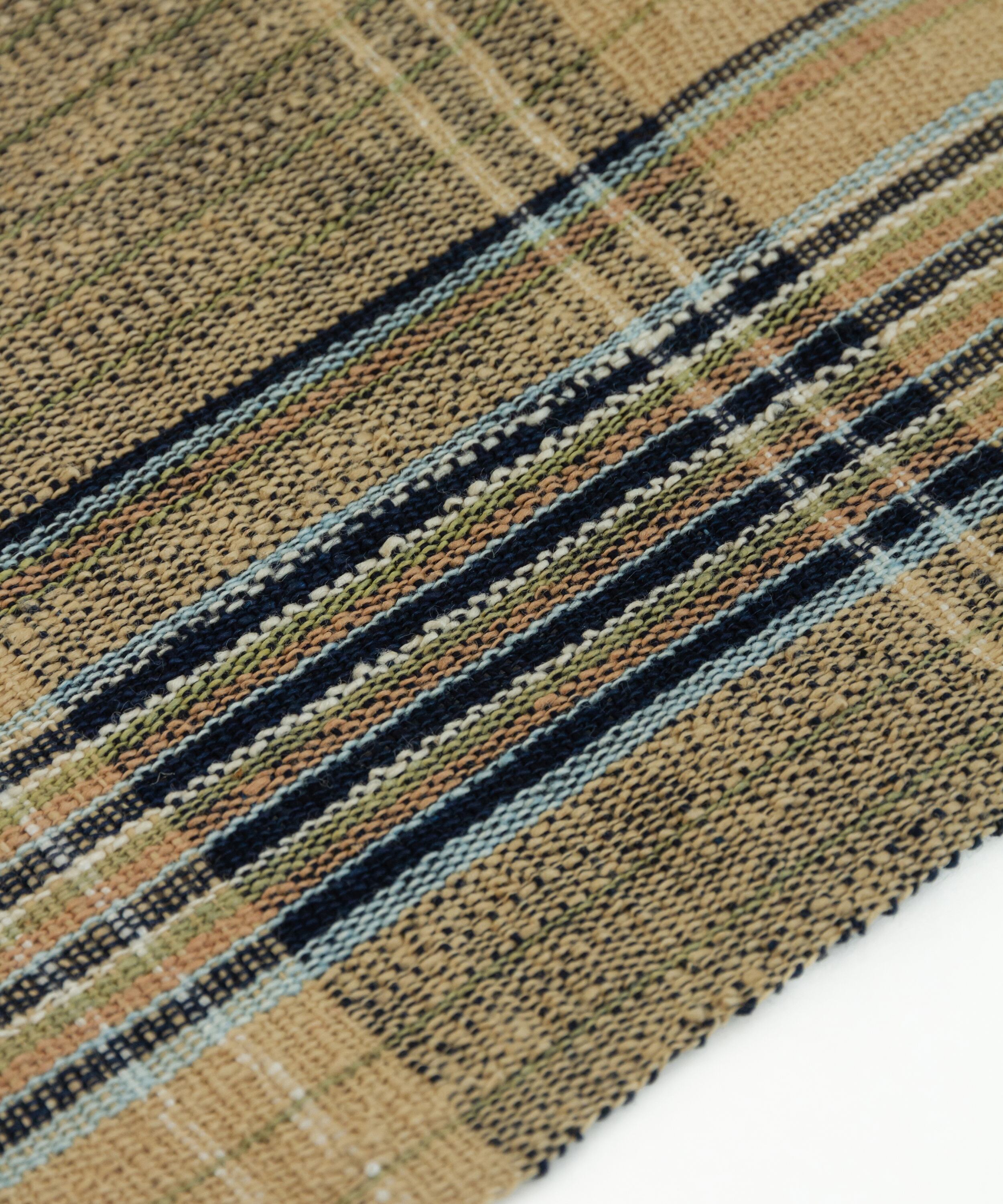 織手は女性が主で、家事育児や仕事の合間に織り上げるのも昔ながらのスタイルです。使われる染料は、栗の皮、こぶな草、やしゃぶしなどの身近な植物や藍を使い、優しさやあたたかみのある縞や格子柄が特徴です。気負わずに、カジュアルで優しいデザインと締め心地ですので、リラックスして街着のお出掛けを楽しめるところが丹波布の魅力でございます。