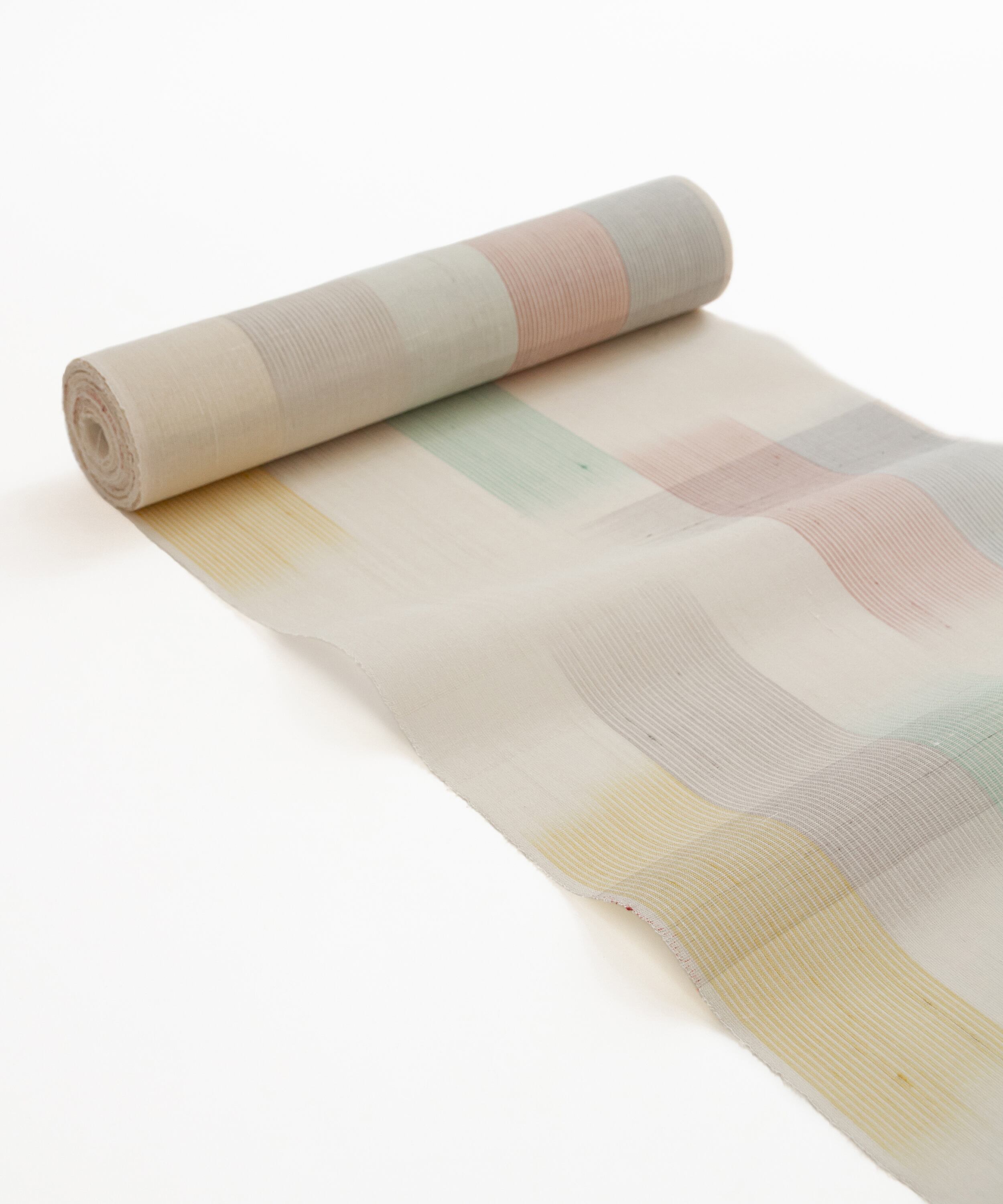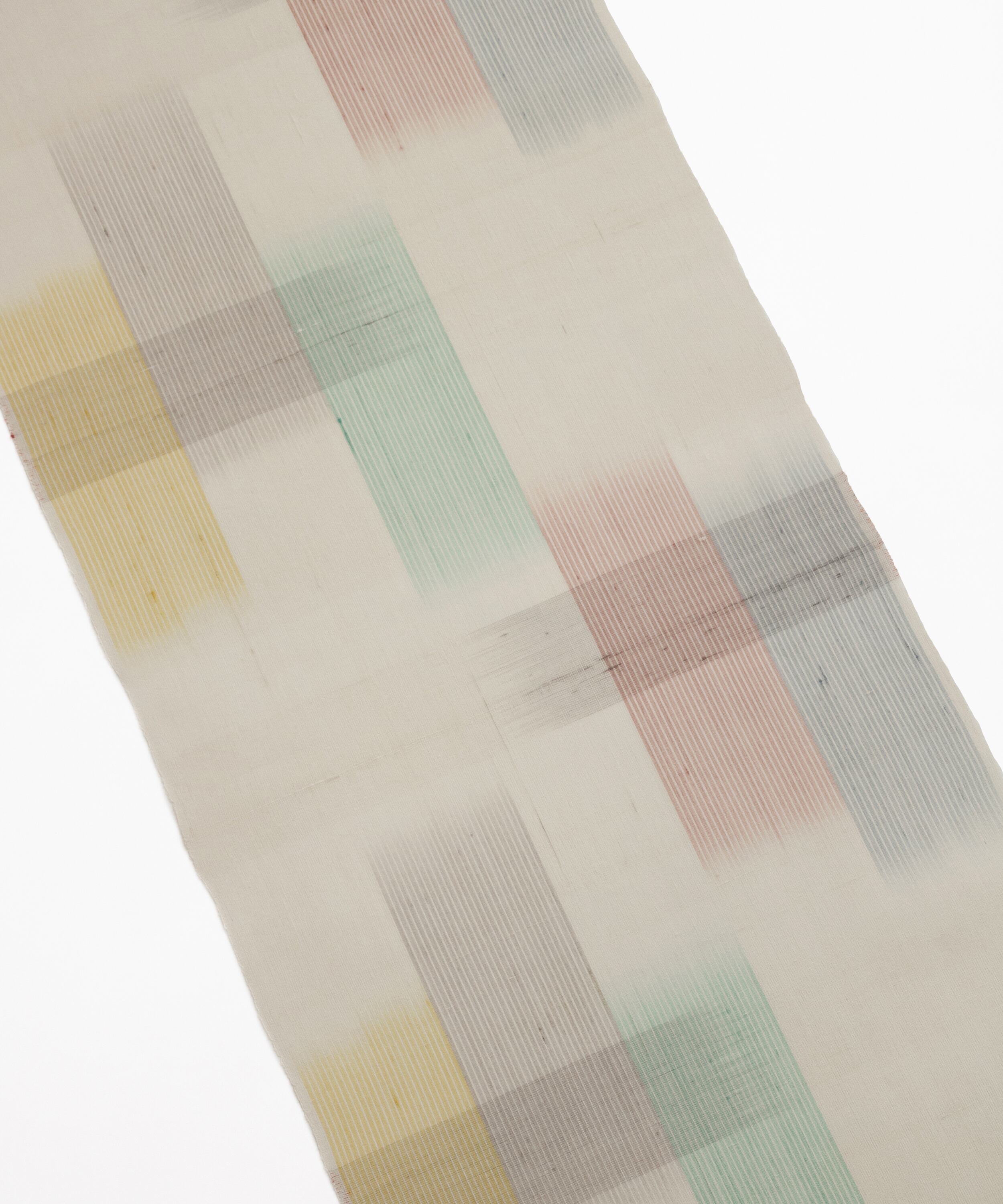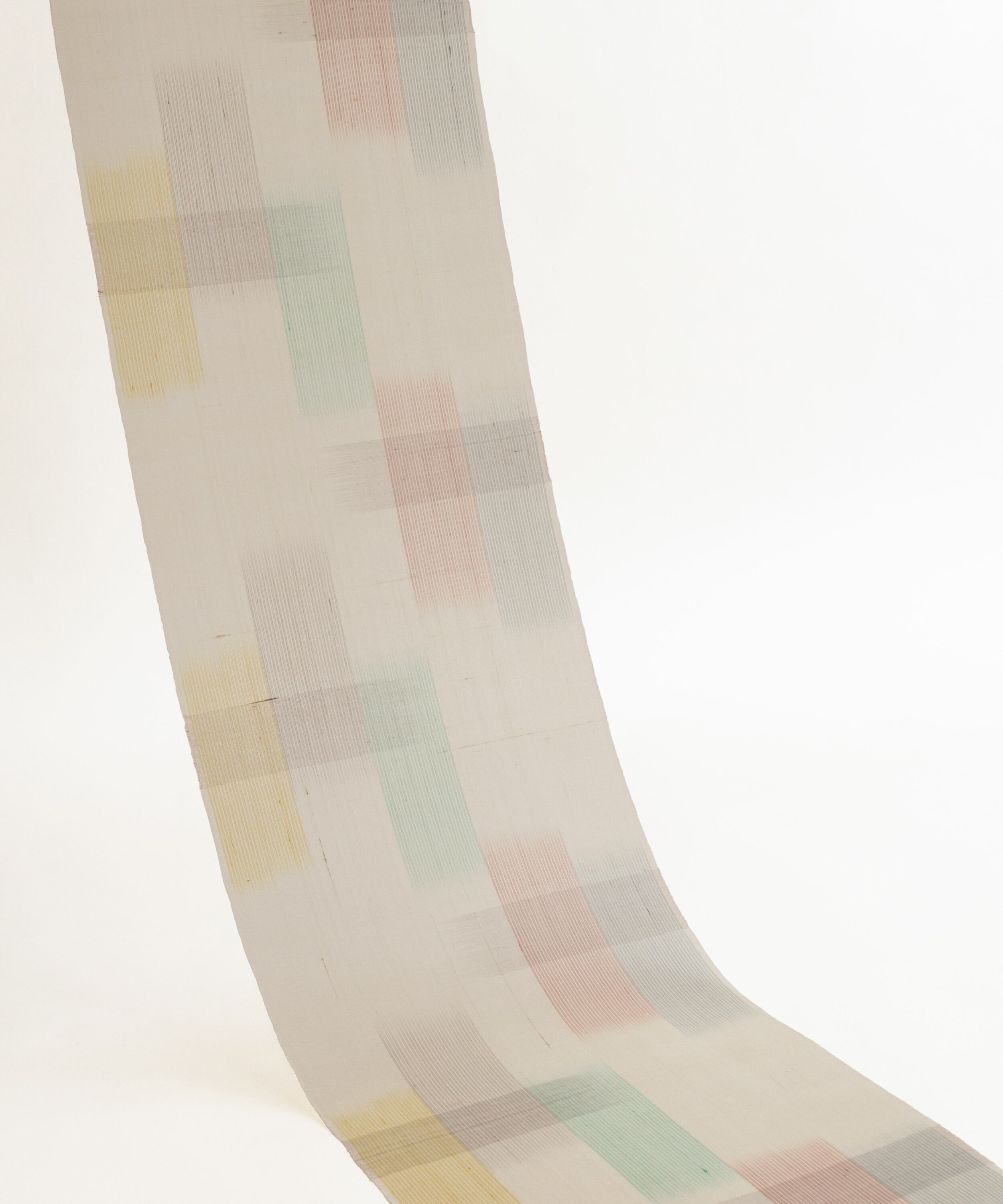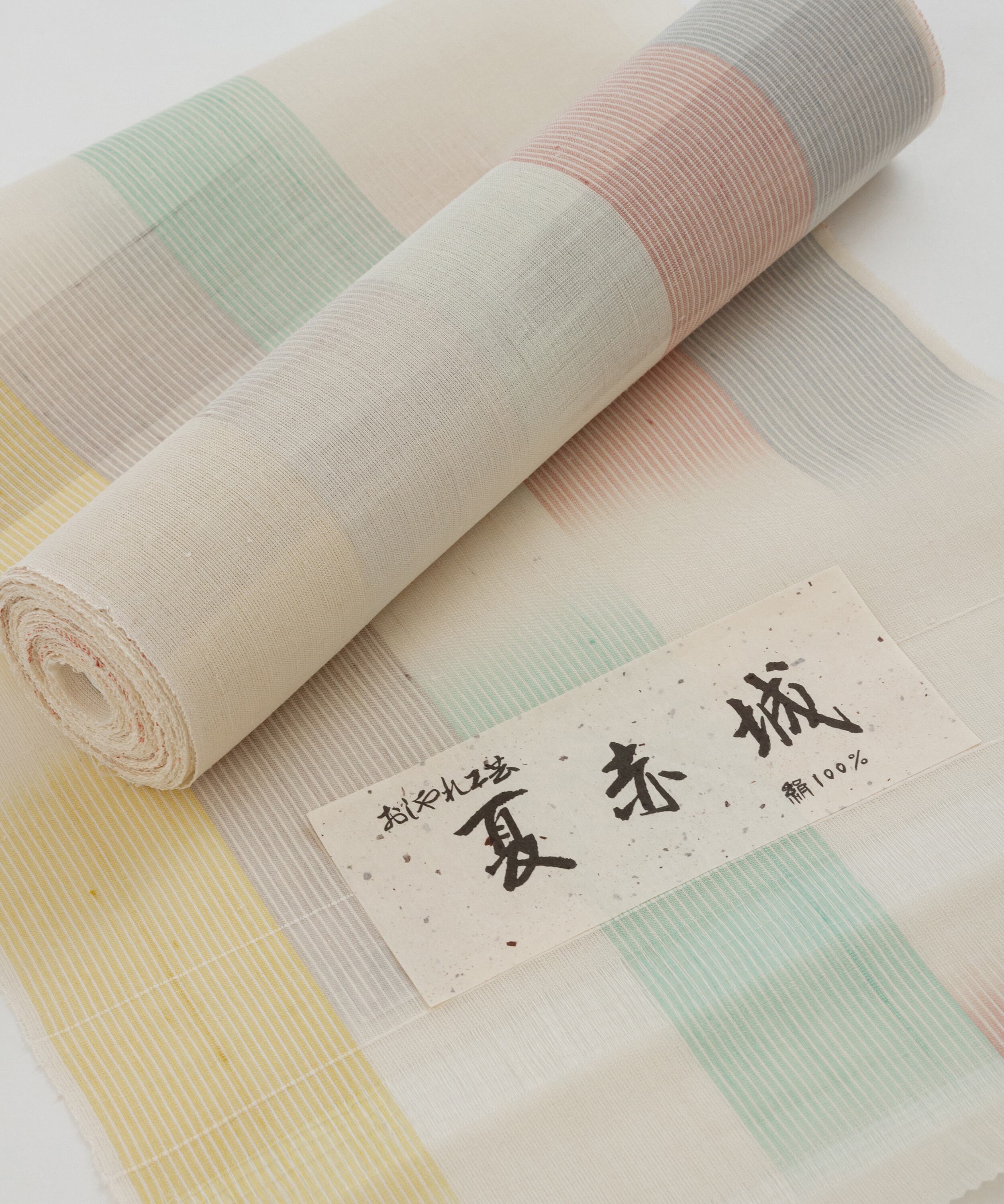 優しいベージュ地にレモンイエロー、ピンク、若草色、ブルー、グレーなどの優しい市松柄。夏赤城紬は、しっかりとした張りと柔らかさもあり肌との離れ感もちょうど良い夏のお召し物でございます。