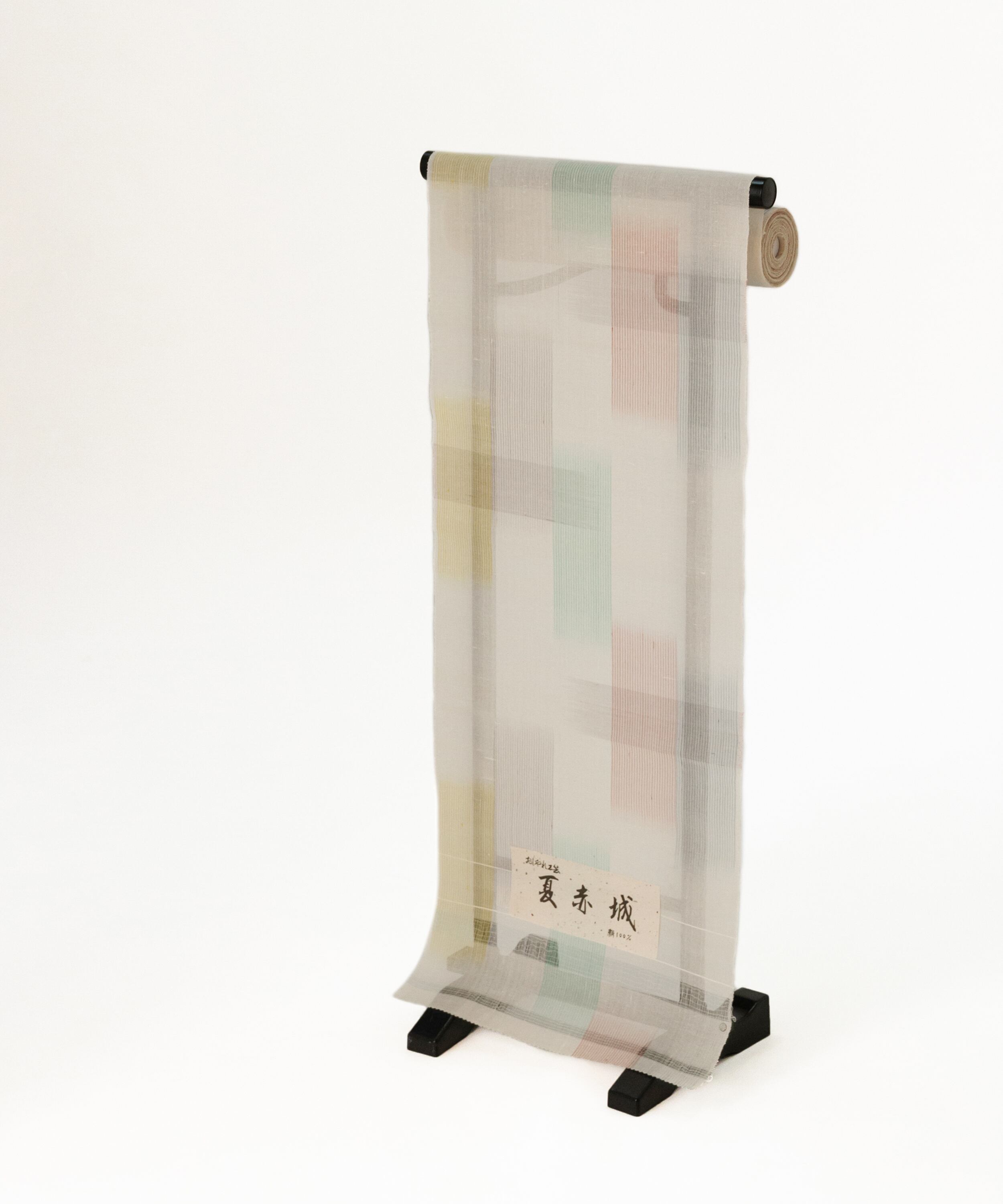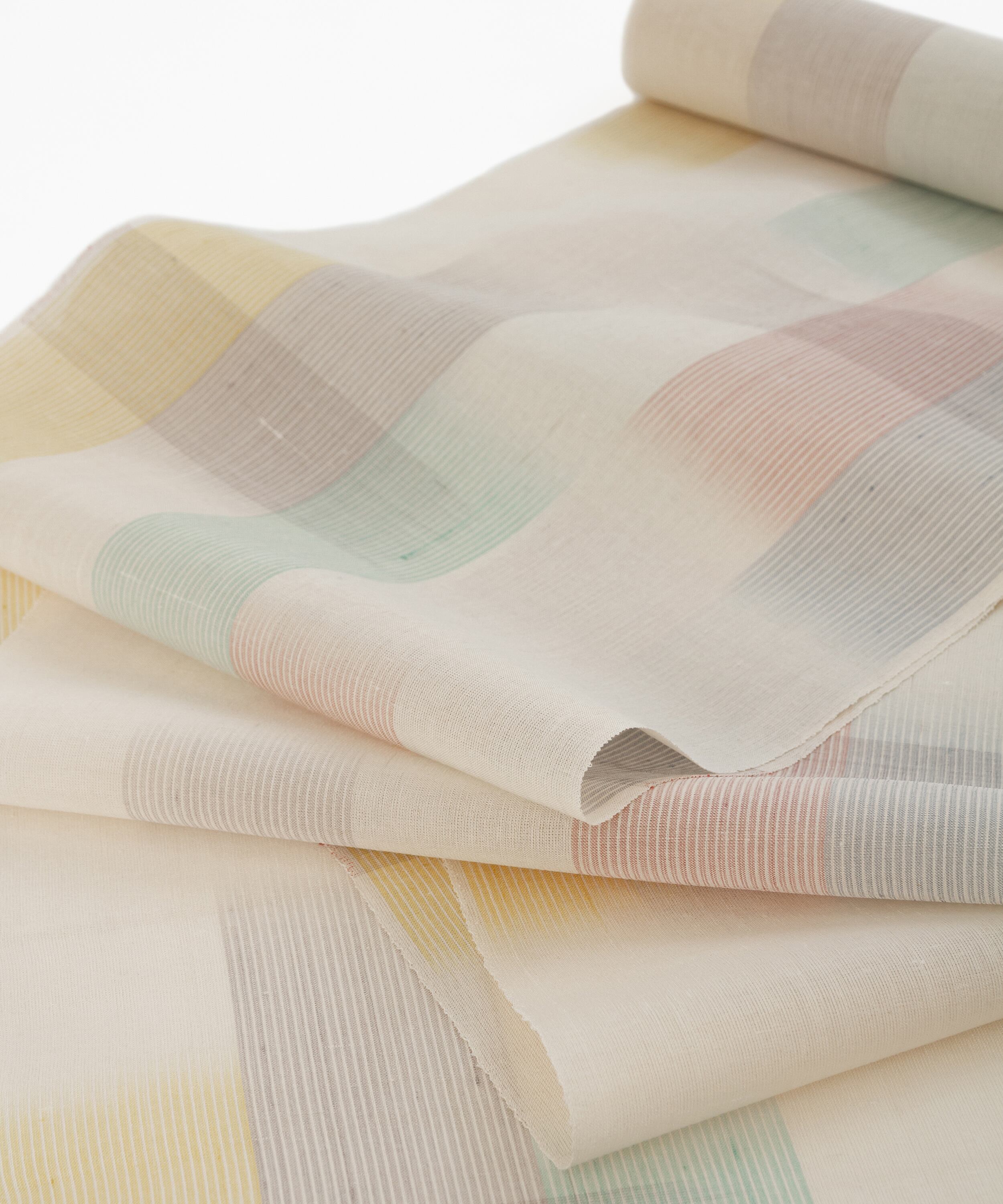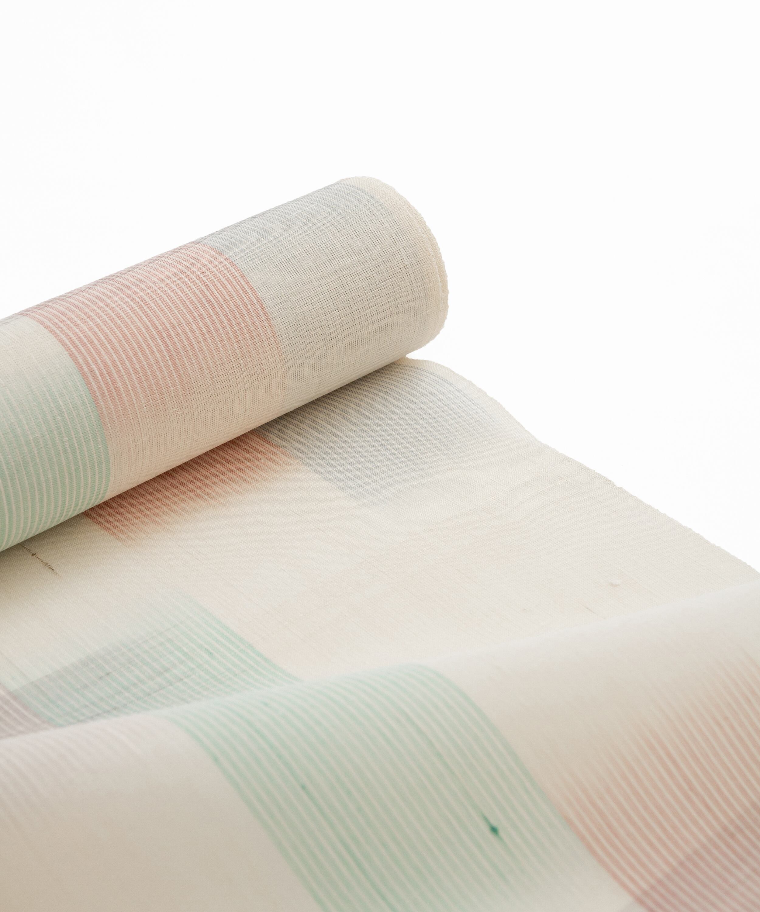 優しいベージュ地にレモンイエロー、ピンク、若草色、ブルー、グレーなどの優しい市松柄。夏赤城紬は、しっかりとした張りと柔らかさもあり肌との離れ感もちょうど良い夏のお召し物でございます。