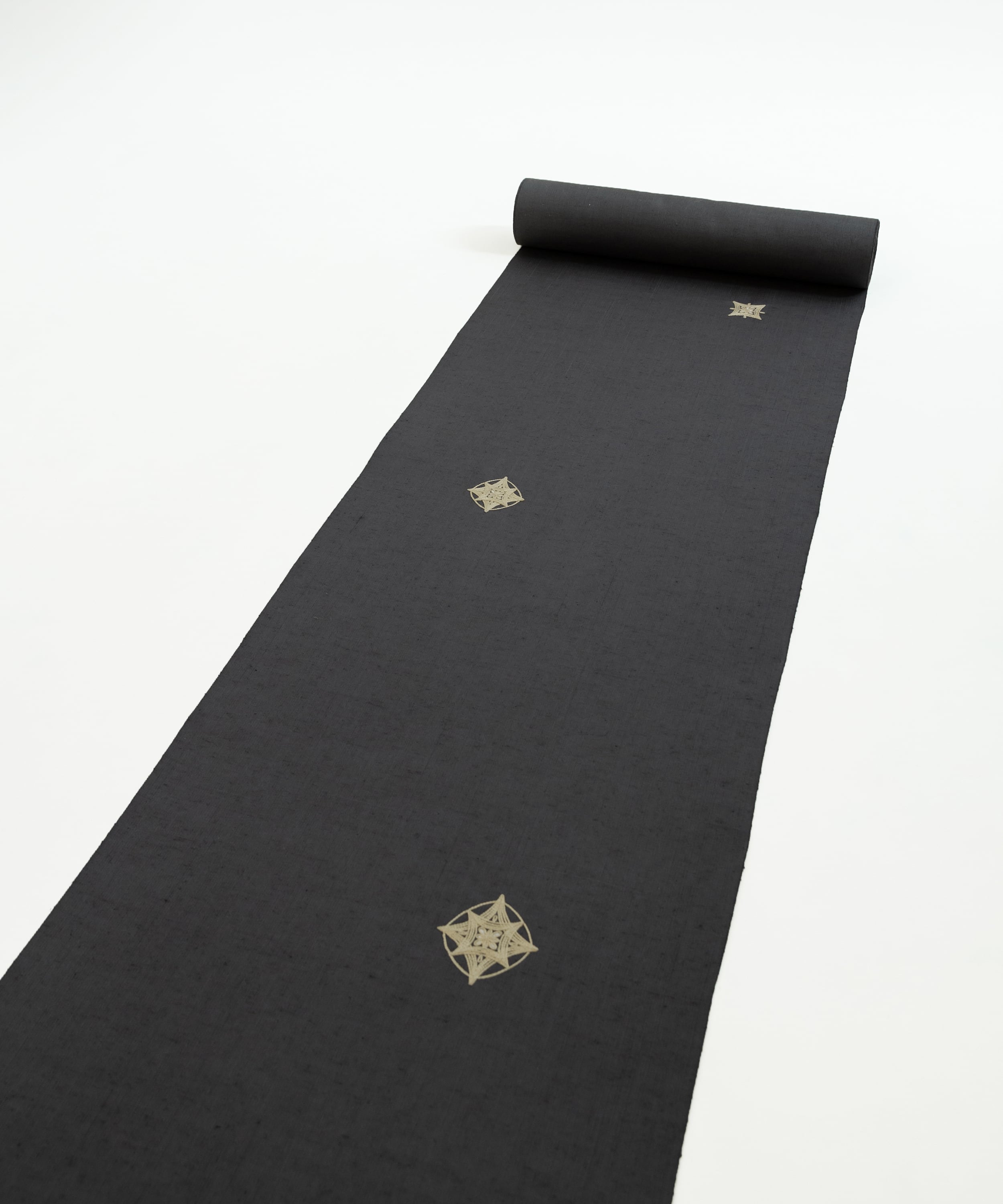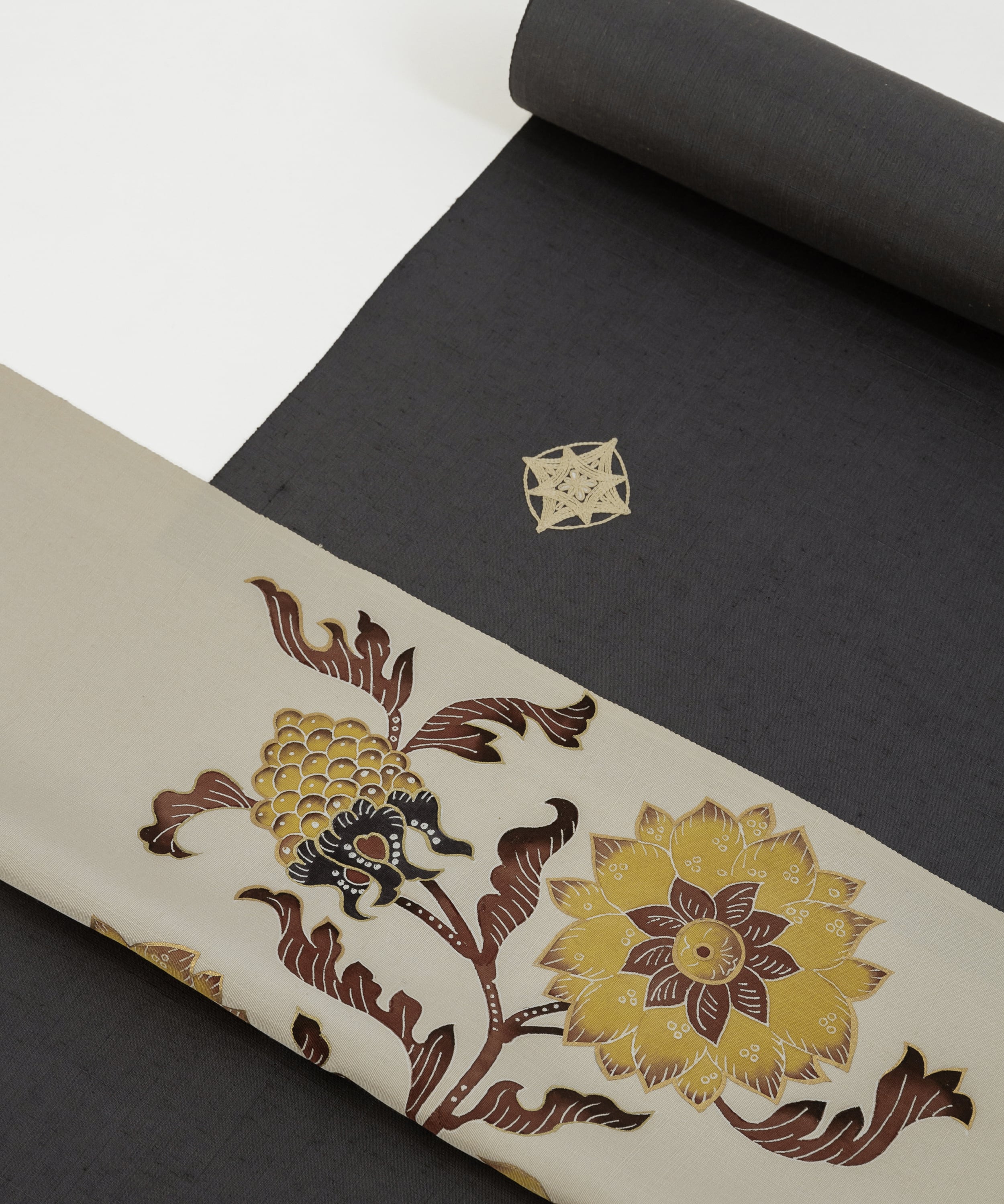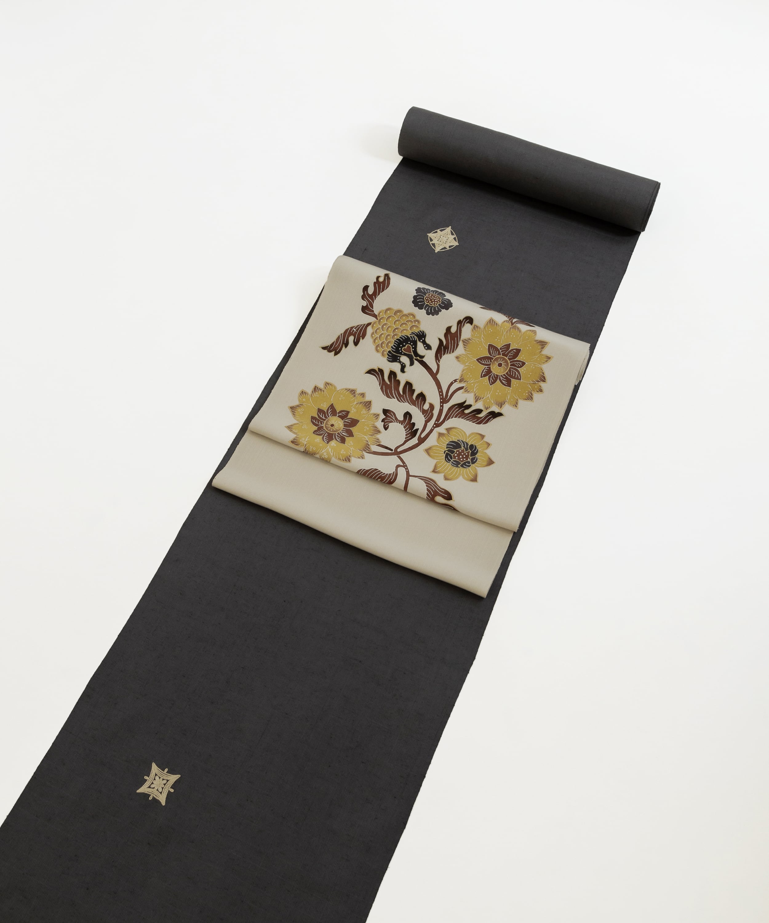 この生糸の中でも細くて金色に輝くゴールデンシルクを選び、質の良い味わい深い生地に織り上げました。深く染められた地色がとても美しく、ムガ糸で施された一つ一つの刺繍の大きさや、それぞれの真の取り方も絶妙です。カジュアルな洒落帯で気楽なお出掛けに、フォーマル寄りの帯でさらに行く先の場面が広がります。